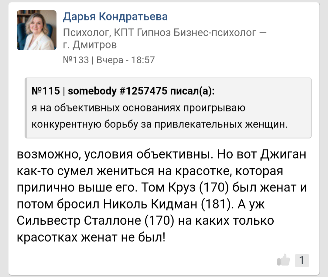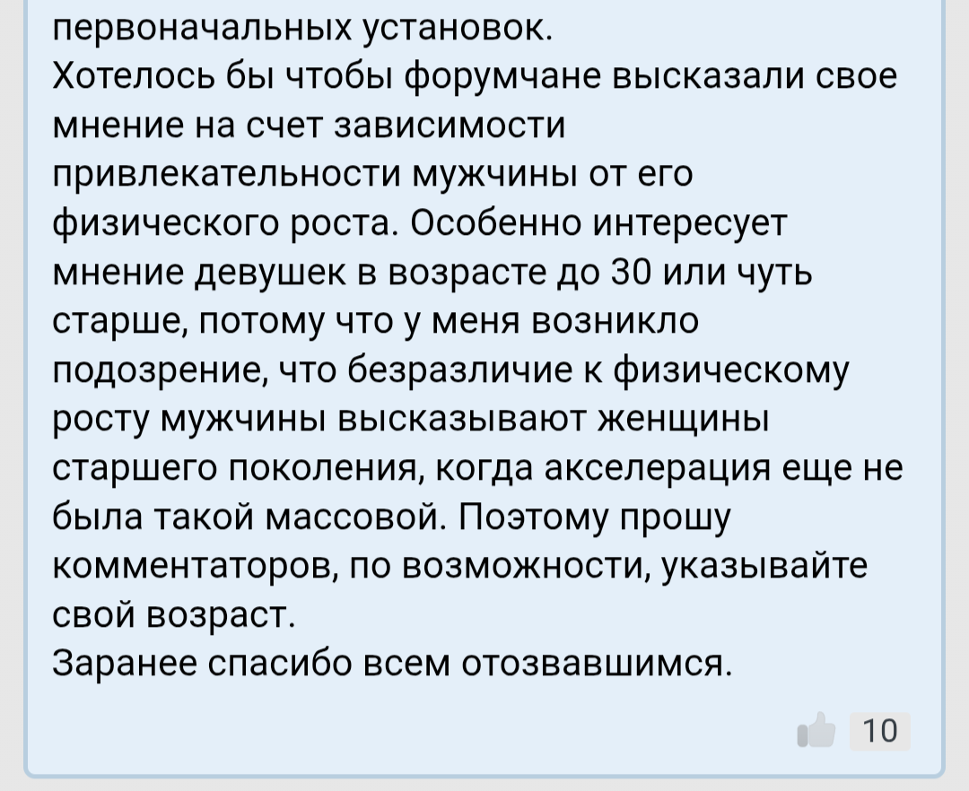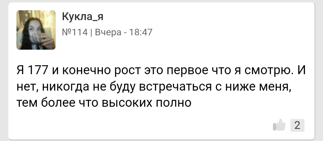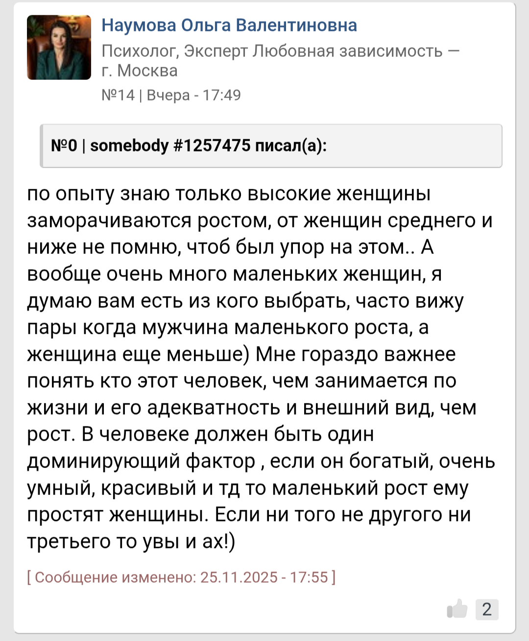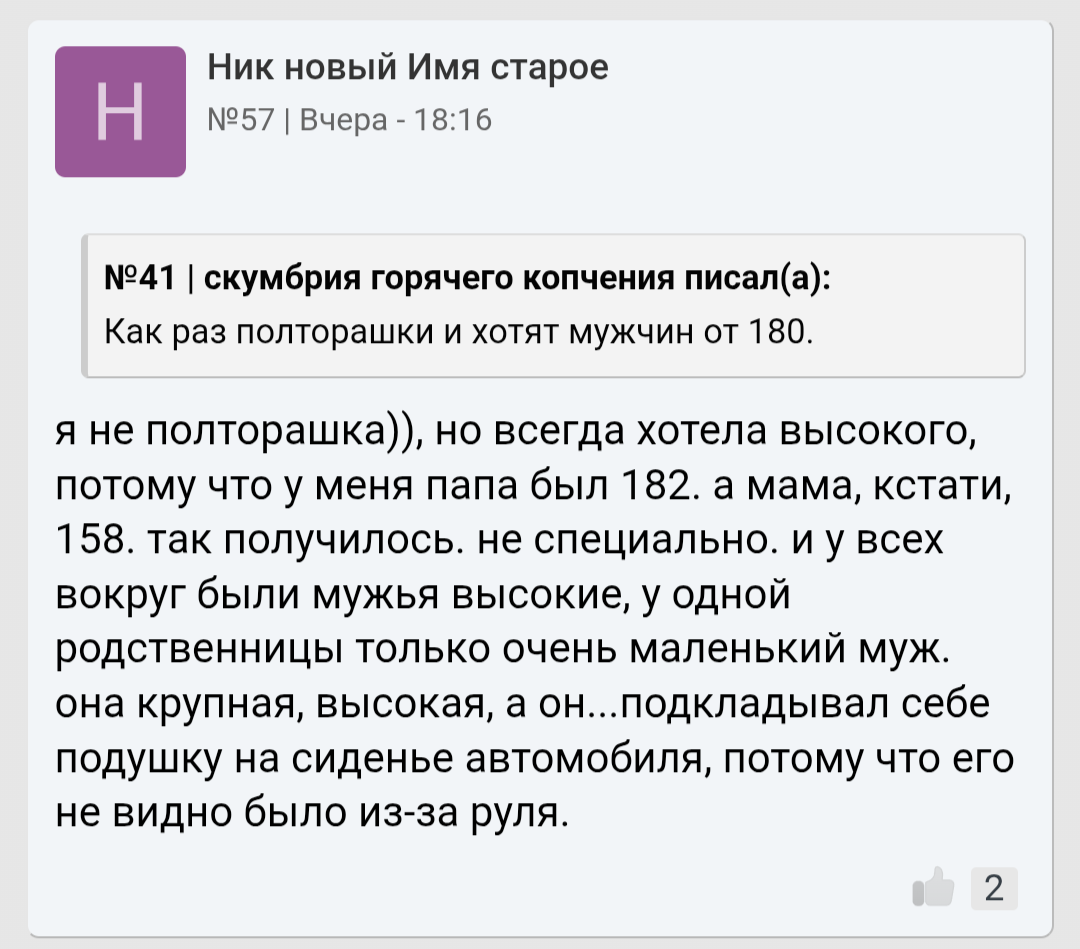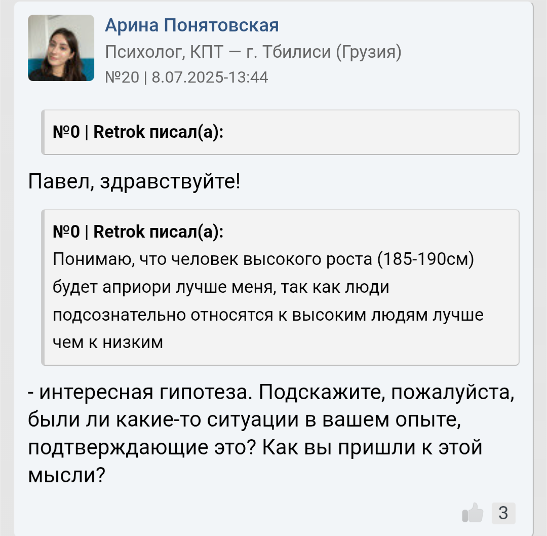 Что забавно, как только речь заходит не просто об опросе про предпочтениям, а пишет конкретный мужчина с конкретной проблемой, то психологи как будто забывают, что в соседней теме писали, что любят рослых