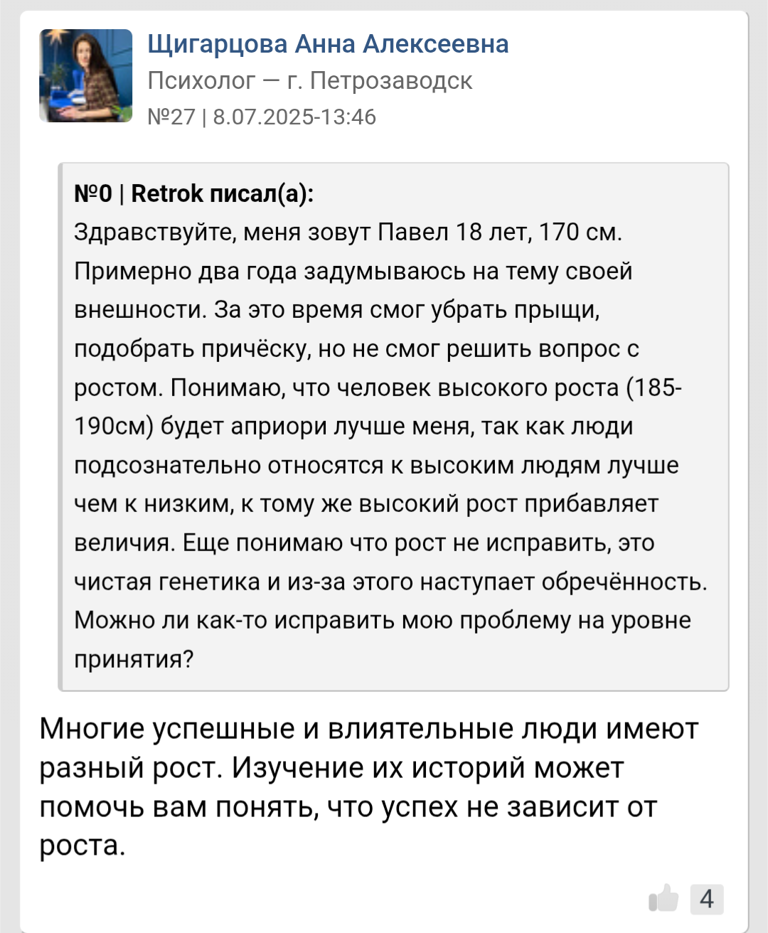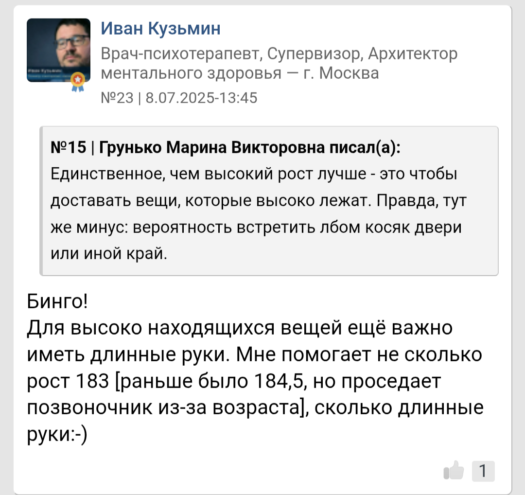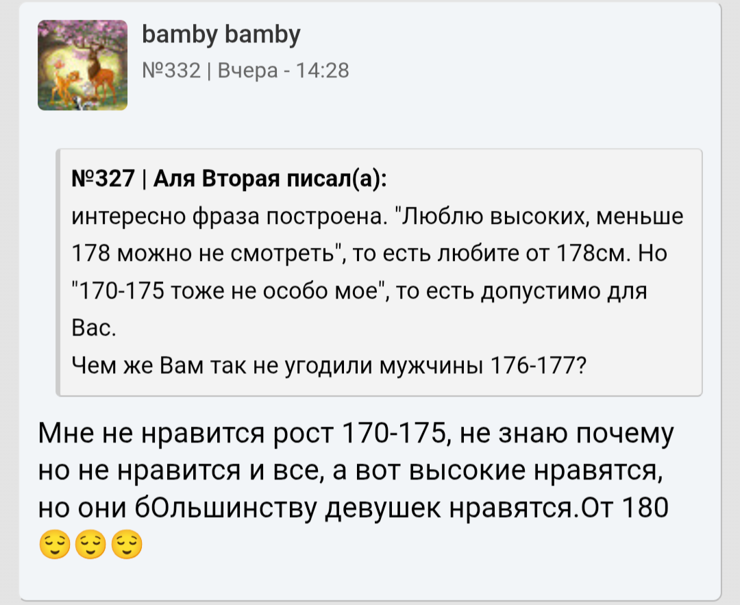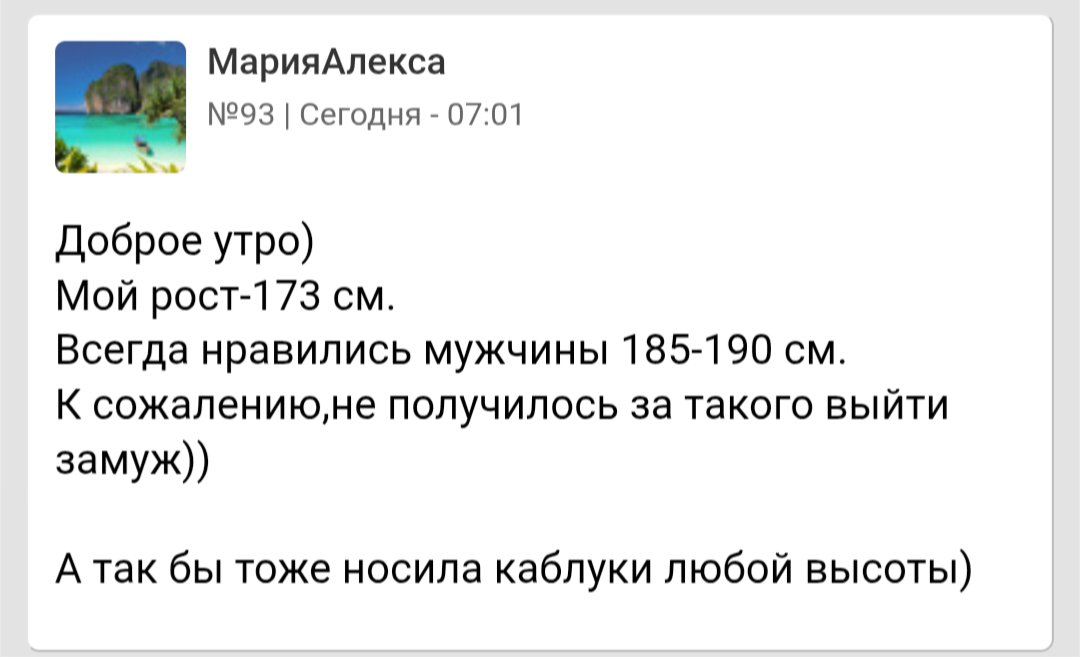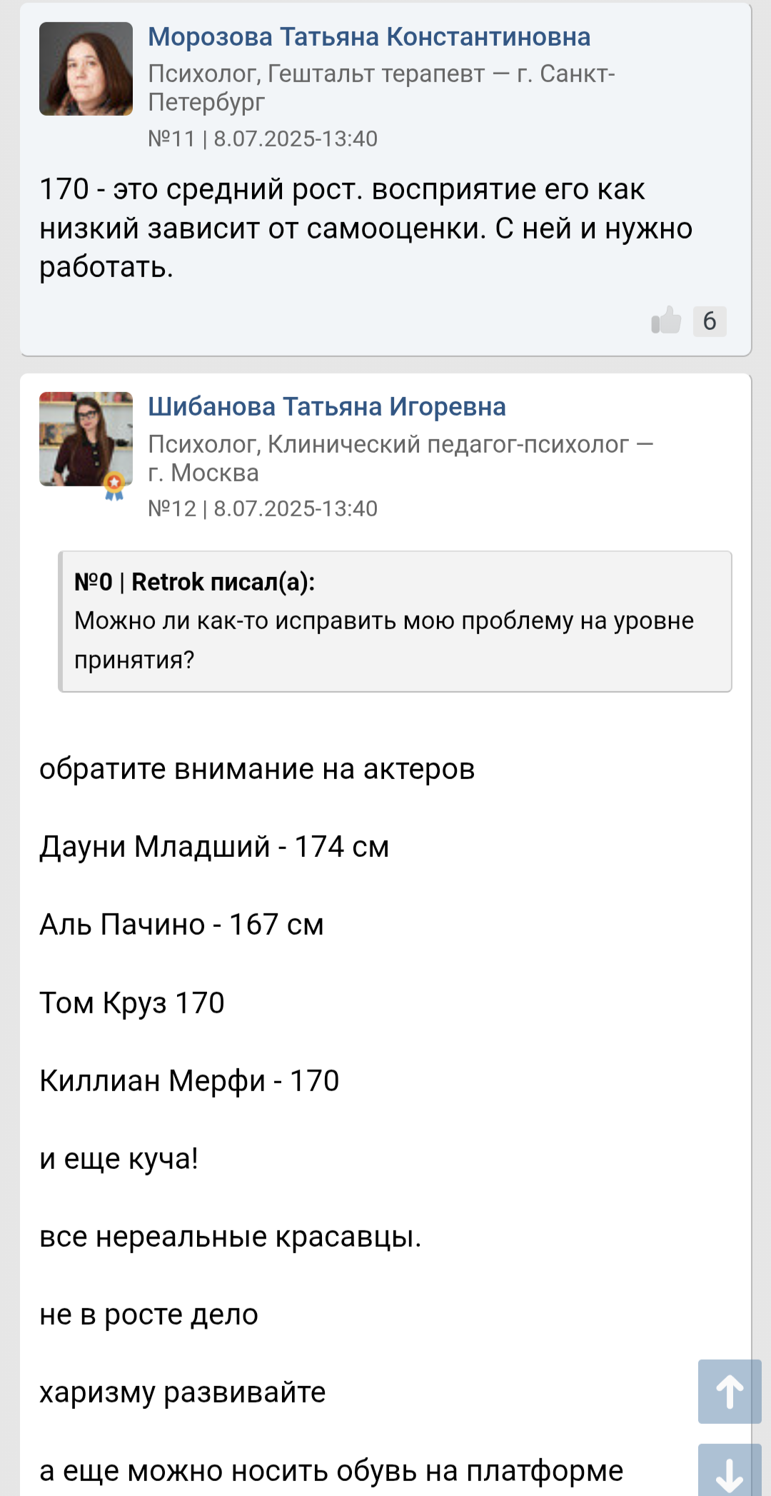 Что забавно, как только речь заходит не просто об опросе про предпочтениям, а пишет конкретный мужчина с конкретной проблемой, то психологи как будто забывают, что в соседней теме писали, что любят рослых