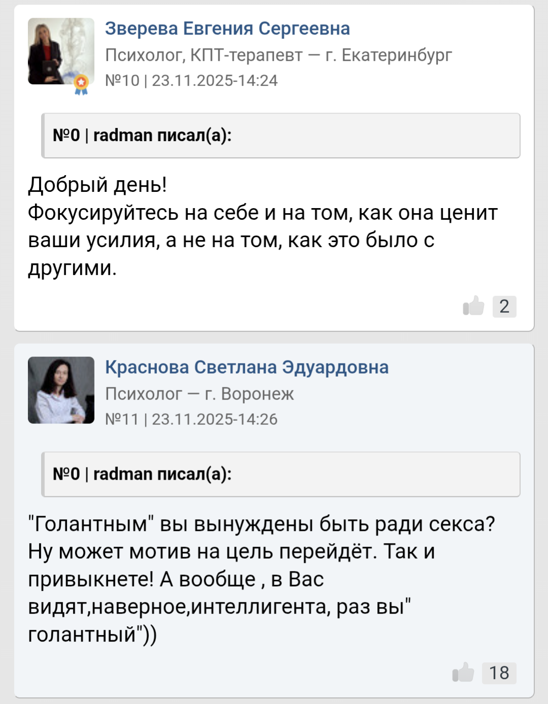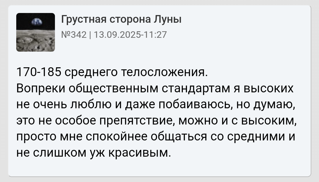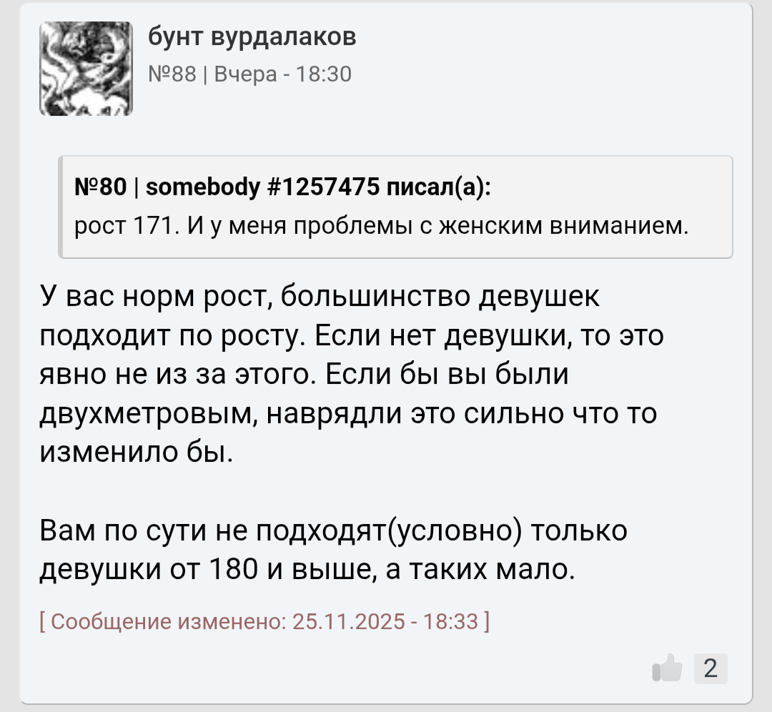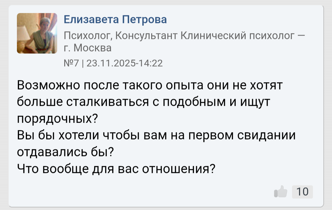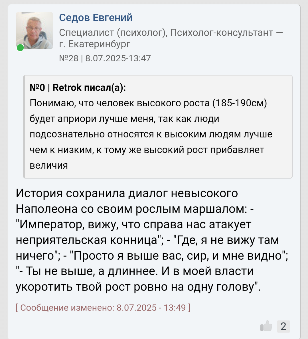 Что забавно, как только речь заходит не просто об опросе про предпочтениям, а пишет конкретный мужчина с конкретной проблемой, то психологи как будто забывают, что в соседней теме писали, что любят рослых