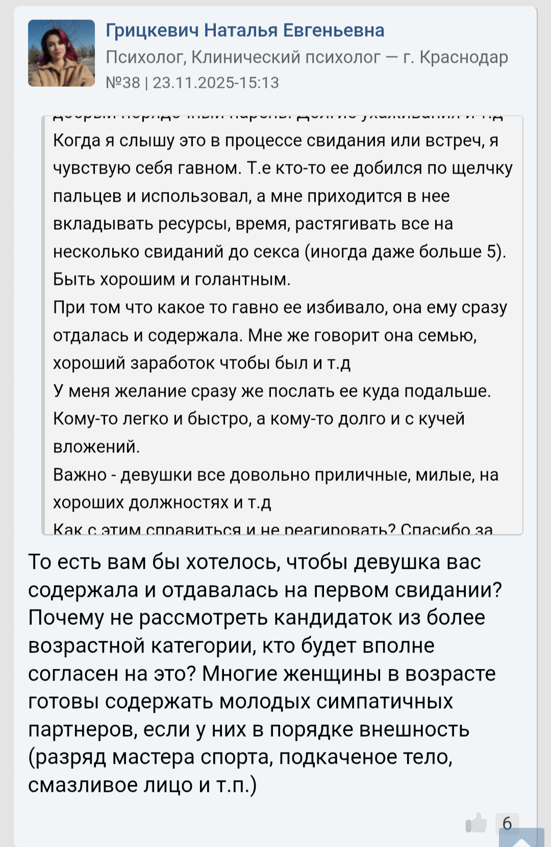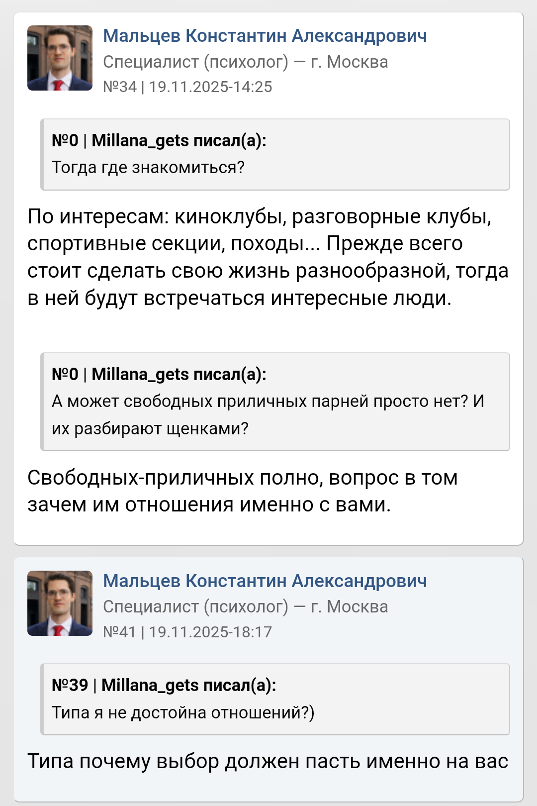 >>10437754 Ого-го! Удивлен! Вот к нему я бы сходил на прием, выговорился. Я давно сижу на том форуме, но впервые натыкаюсь на такое, чтоб психолог не подпевал своим коллегам женского пола, а четко написал, что думает. Почитаю, что ему там ответят