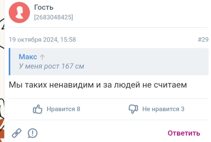 >>10437642 И ещё одно. Если вы думаете, что я не знаю как это быть низким, то это не так. Я до 15 лет был низким до 170 роста. Потом с 15 лет вымахал за пару лет и вплоть до 25 понемногу подростал. За этим я не успел вес набирать, был дрыщем, 55-60кг очень долго и социум привык ко мне до 15 лет,относился так же, потому что вес был такой же. А 12-14 это самый ебанутый возраст в подростков. Это сейчас зумеры в 13 лет 180 ростом, а я был 163-165. Так что хуйни тоже ощутил в свое время.