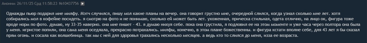 >>10437148 у меня батя в 90-е сначала был милфхантер по богатым 40+ потом отрыл не менее богатую мою Ле Маман (20 лет, 10/10) и с таким же успехом был у неё на содержании фактически