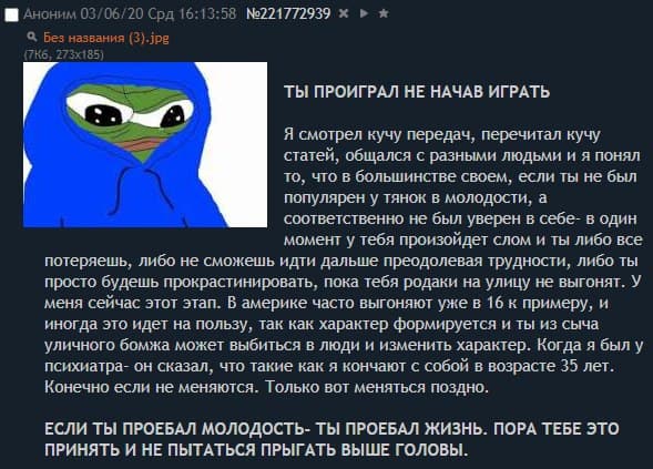 >Принимая блэкпилл ты станешь некрасивым, потому что потеряешь уверенность и обаяние Я уже отвратителен был женщинам и без блэкпилла. Как вот это заебало: "Ты озлобленный, вот тебе и не дают". Нет, я озлобленный потому что мне не дают. Заебали настолько простейшую причинно следственную связь путать. Озлобленными становятся. Раньше я таким не был и что-то ни одна тян все равно меня за человека не считала, при том что я к ним нормально относился и никакой озлобленности не имел.