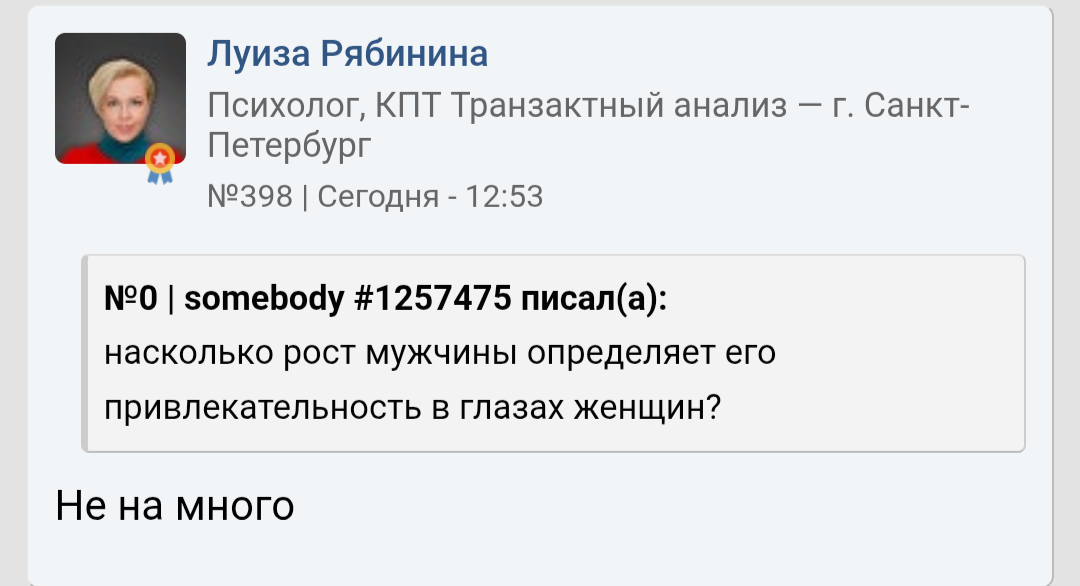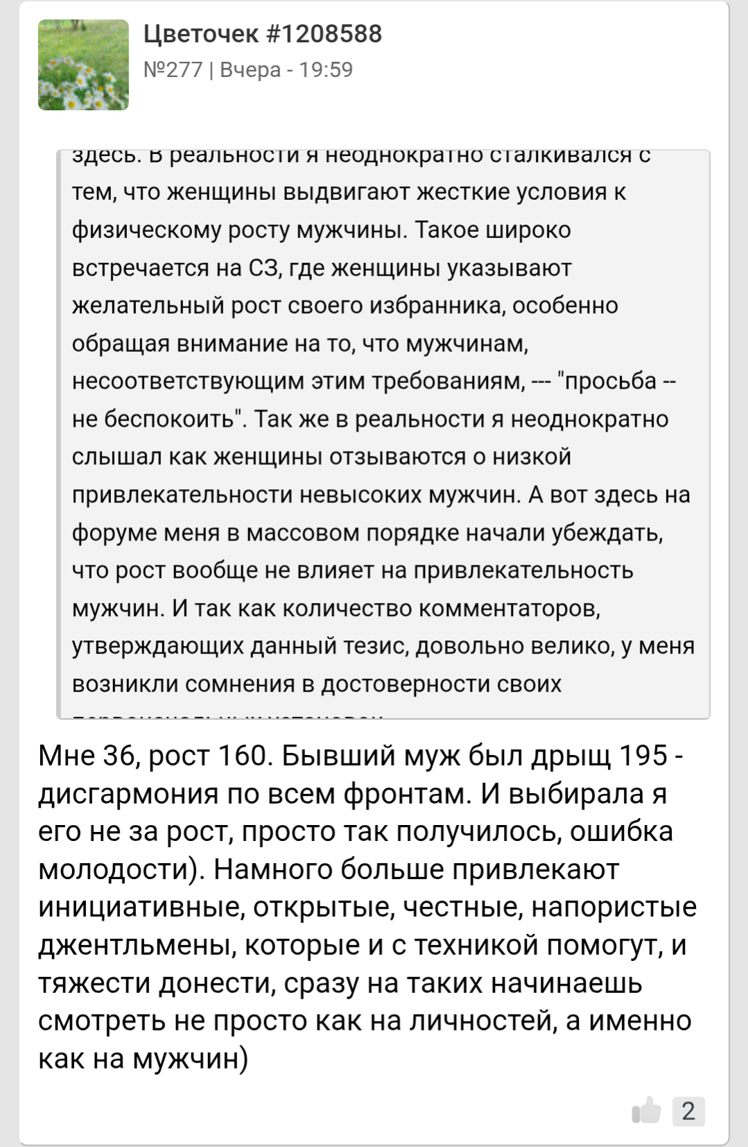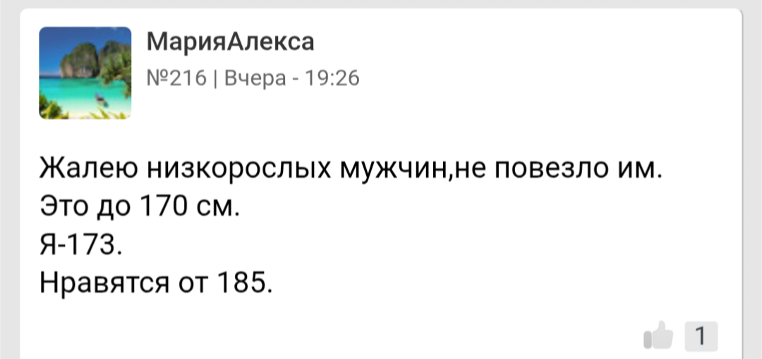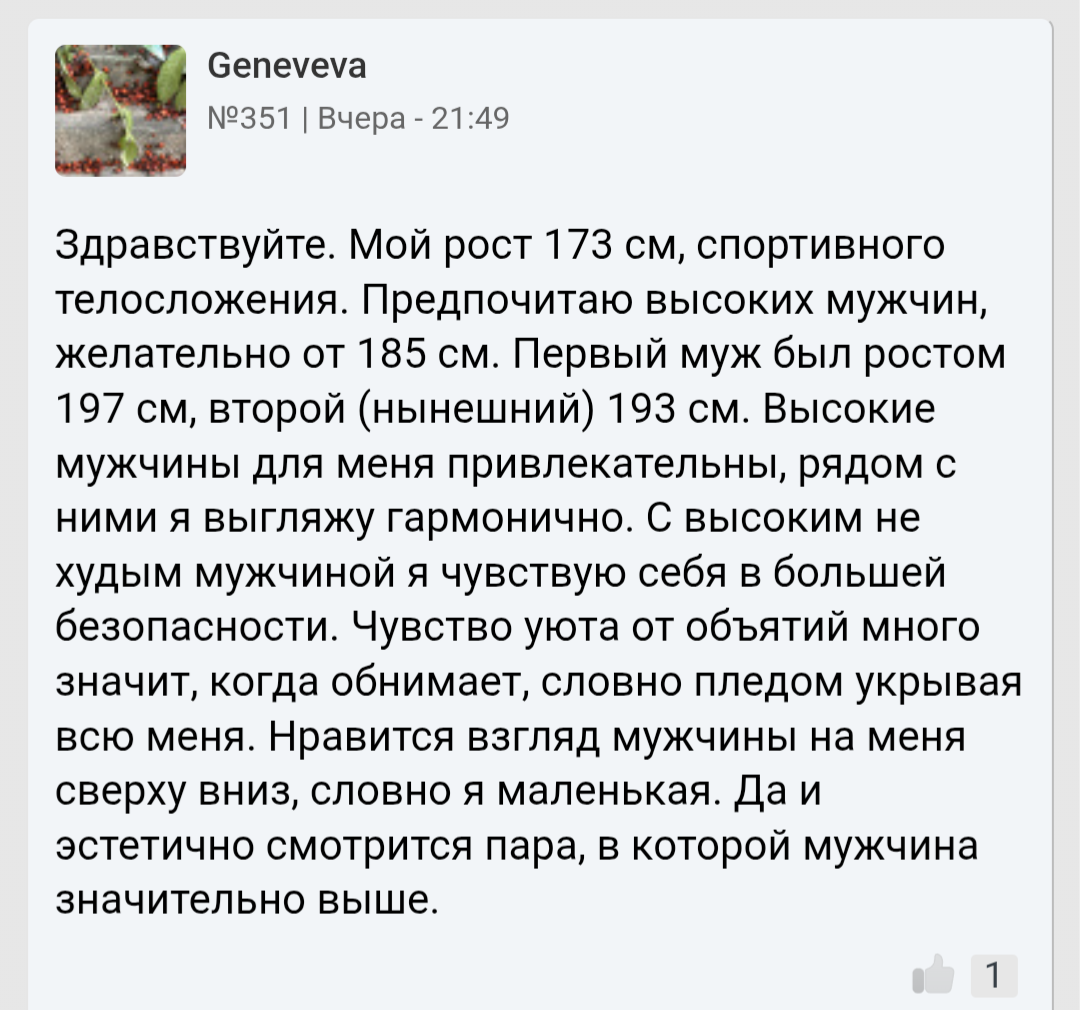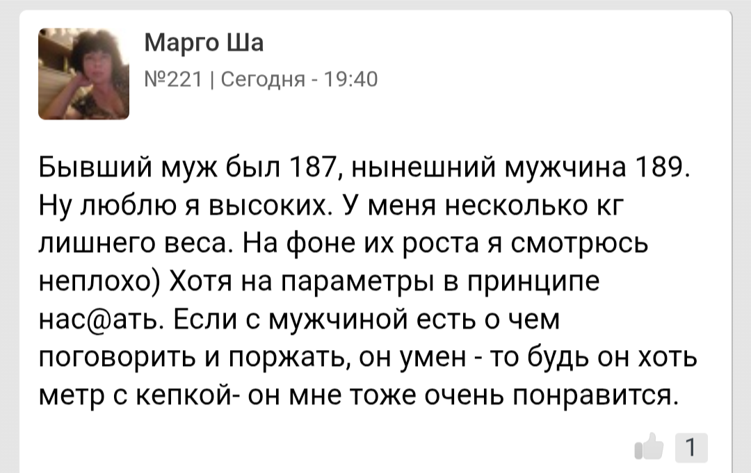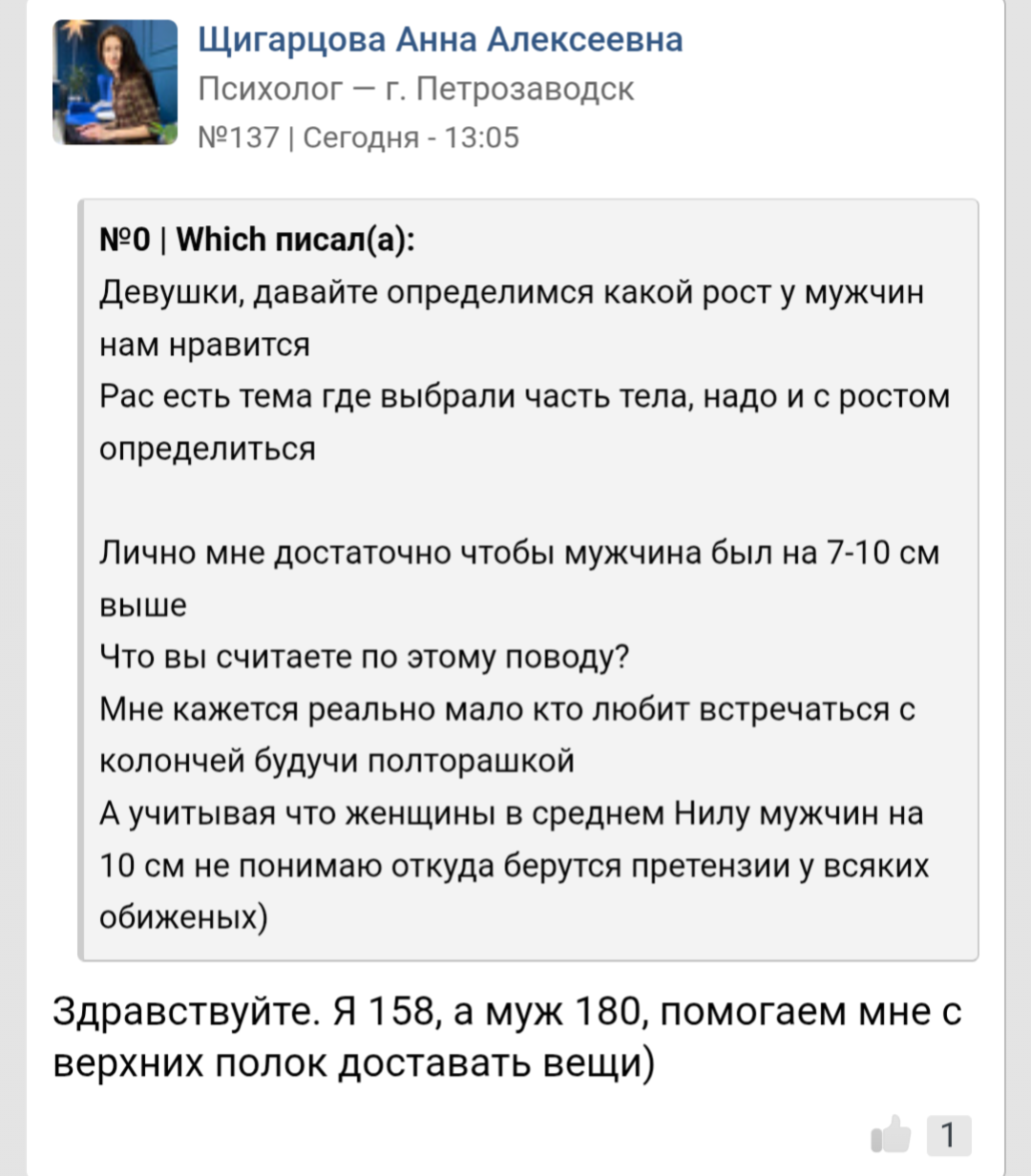 >>10439272 Ну это одна такая на миллион женщин. Остальным рост не важен. Более того, многие пишут, что им как раз нравятся невысокие мужчина 165-170. А если парень 175 - то это вообще идеал роста, просто золотое сечение Леонардо Да Винчи.