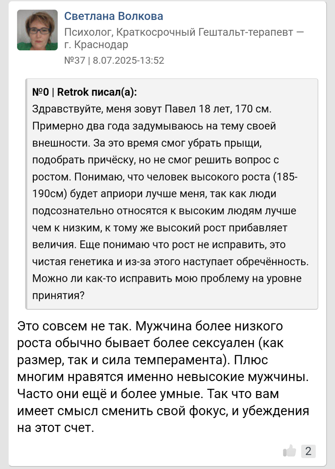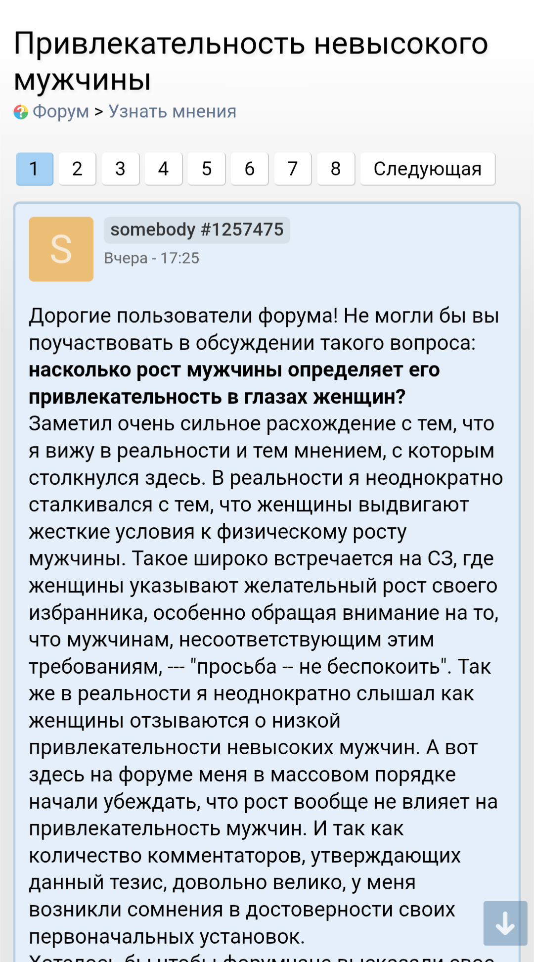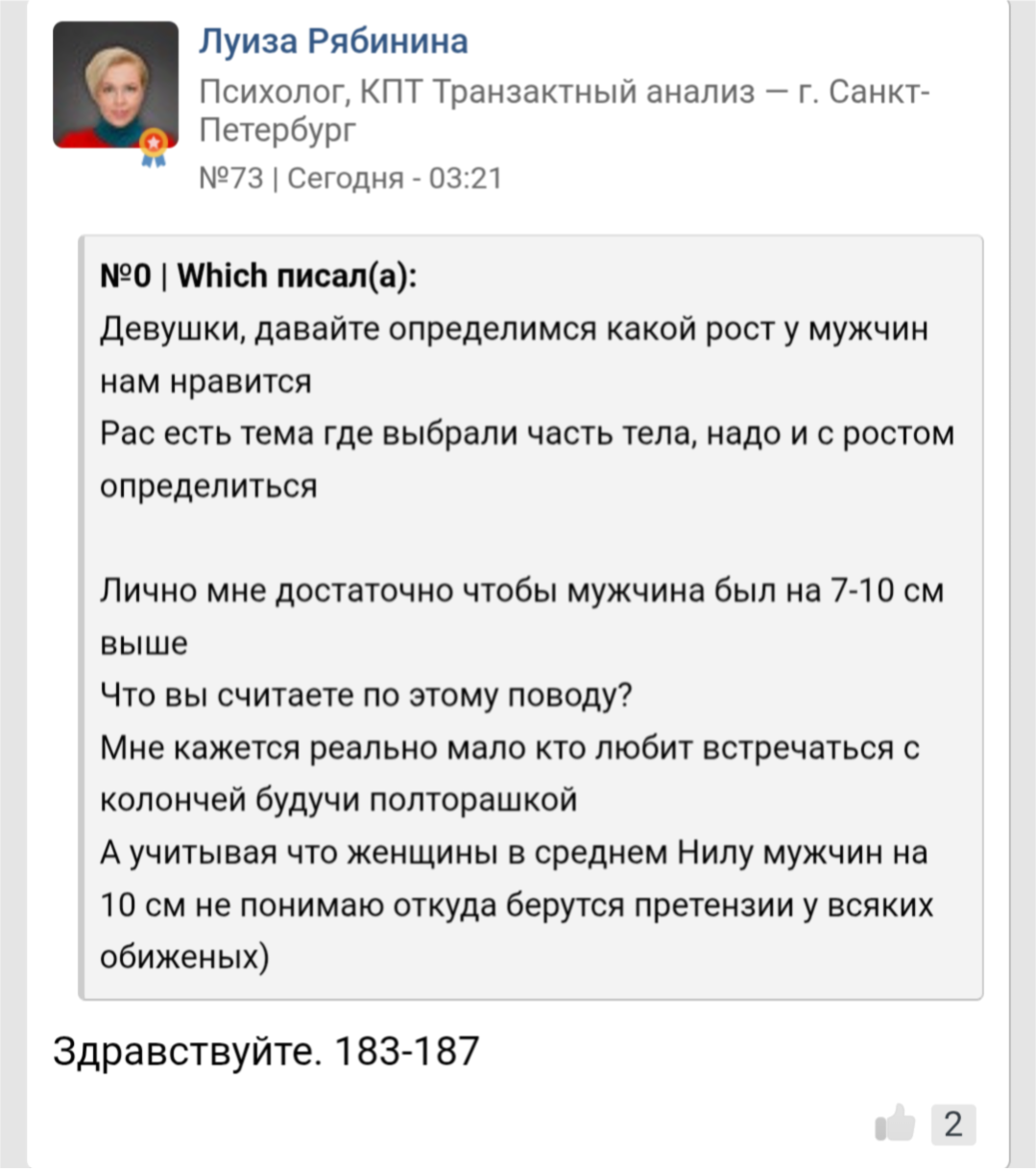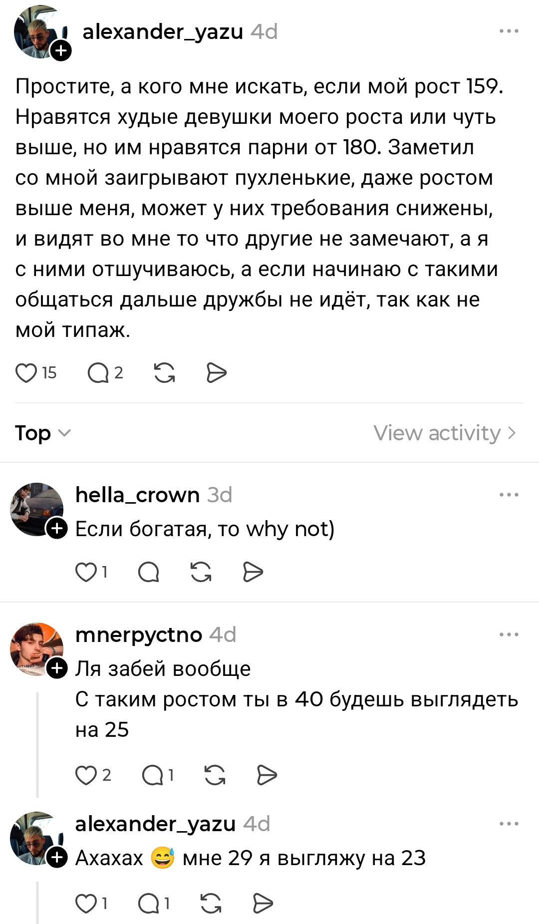>>10438543 Видимо, только смириться. Это его единственный пост в новой теме мелкого анона. Остальные ему пишут, что рост не важен и достаточно быть выше 165