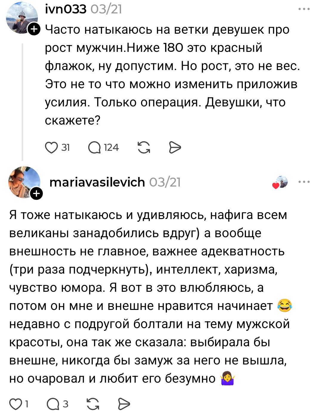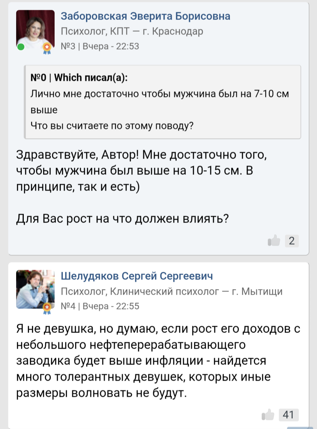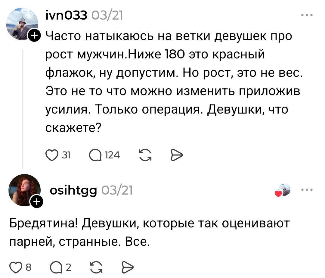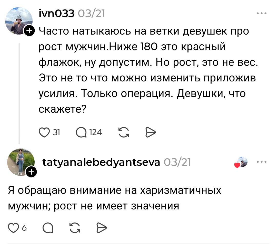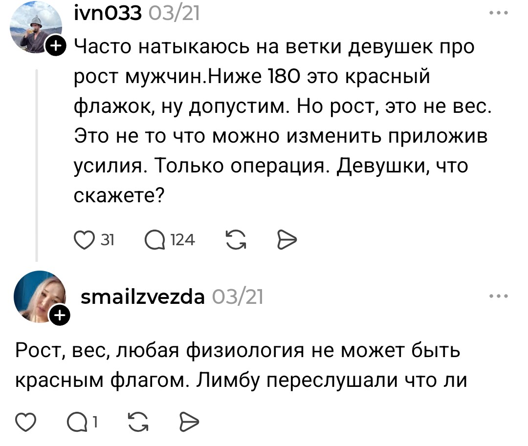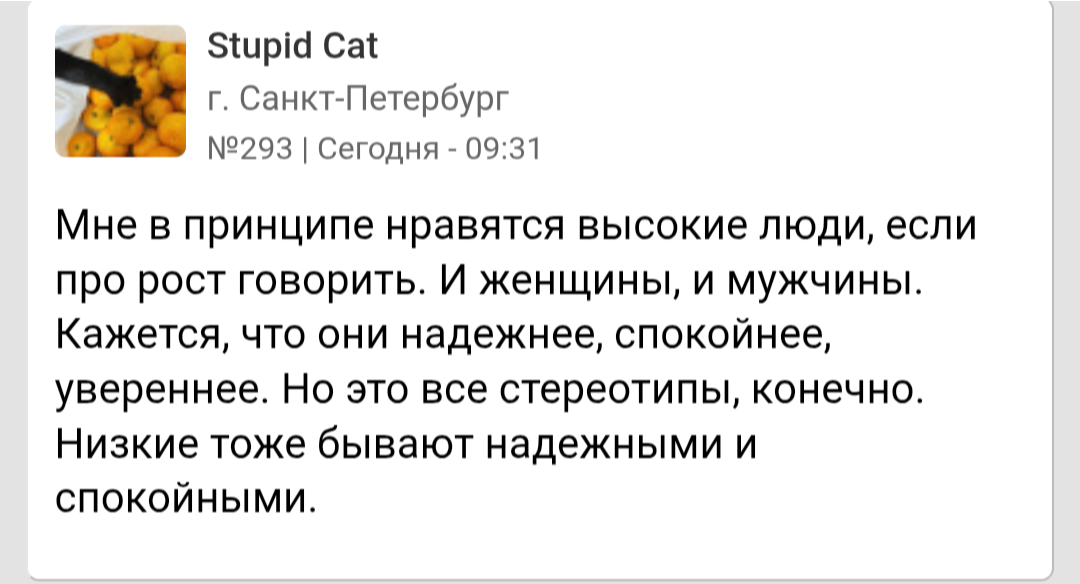 >>10438581 > данная дамочка пишет ему, что рост не важен, а в другой теме уже иное Нет, не пишет. У тебя огромные проблемы с восприятием информации. Мне вот тоже нравятся высокие тянки, это никак не противоречит утверждению, что рост тянок имеет малое значение в привлекательности в глазах мужчин.