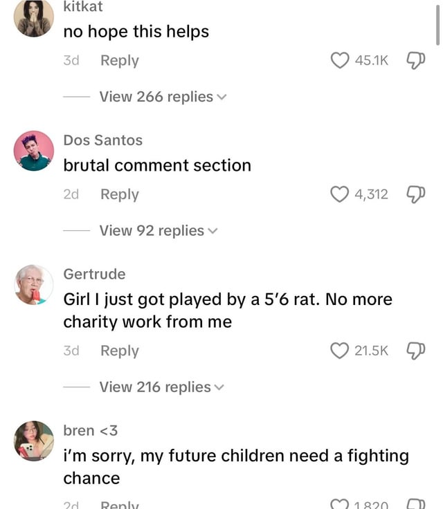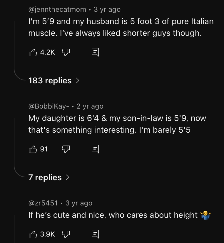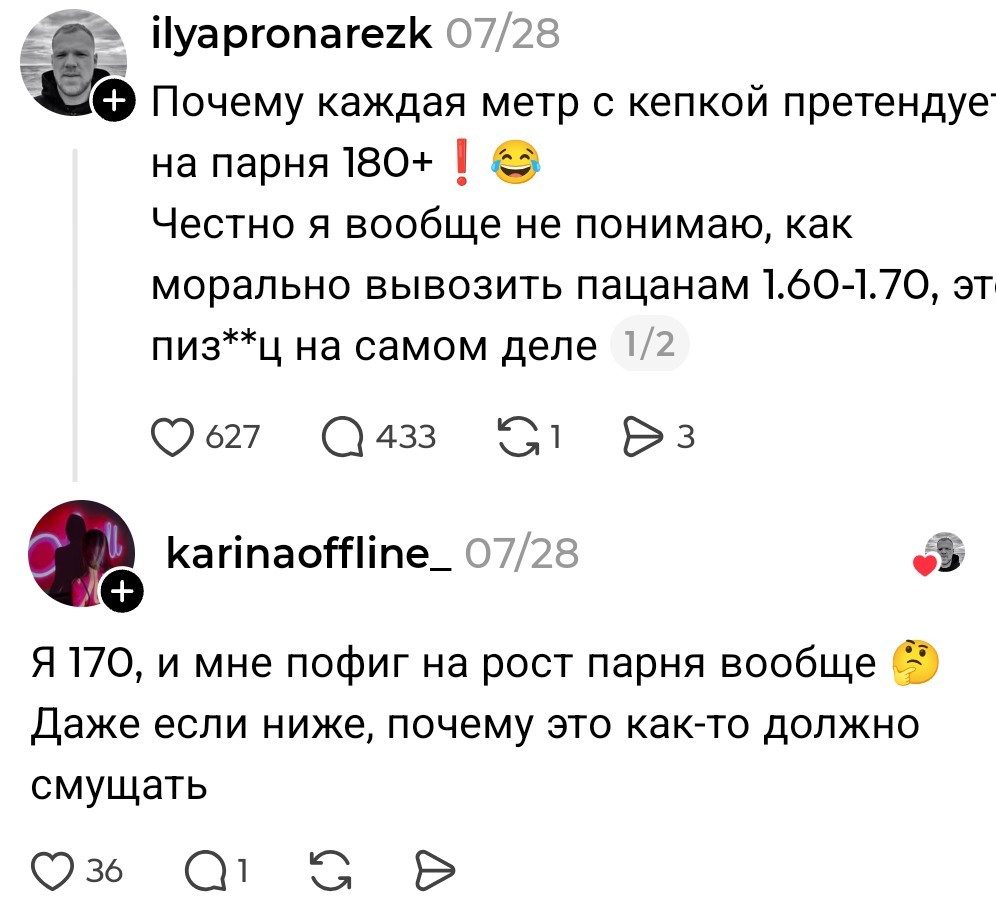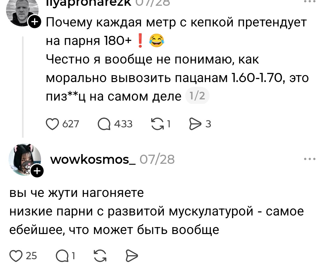 >>10439301 На сайтах знакомств много раз видел заявления типа ниже 185 даже не пишите. Видел даже 190 плюс фильтр. Но вот чтобы "выше 180 не пишите" не видел ни разу. 185см инцел >>10439316 > 2 Там у первого проблемы гораздо хуже роста, у него челюсти нет >>10439325 > идеальная разница в росте Интересно, а женщины сами хотя бы подозревают, что низкие женщины тоже никому особо не нравятся, просто мужики ебут все подряд?