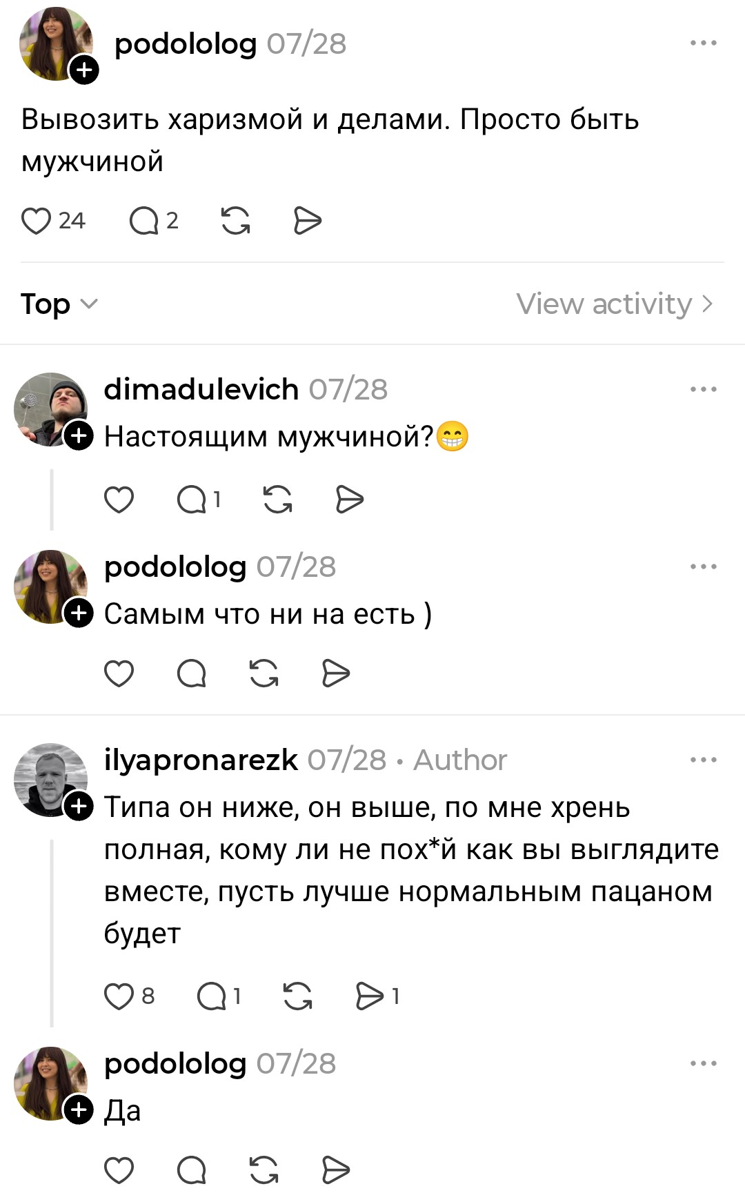 >>10438803 Когда изредка мелькают пикчи с рейтом мужчин, все что выше 7 для меня всегда было антипривлекательной кринжатиной и не думаю что я в своих вкусах особенная. Вы переоцениваете вкус женщин, как и женщины почти всегда в ахуе кого мужчины считают красивыми.