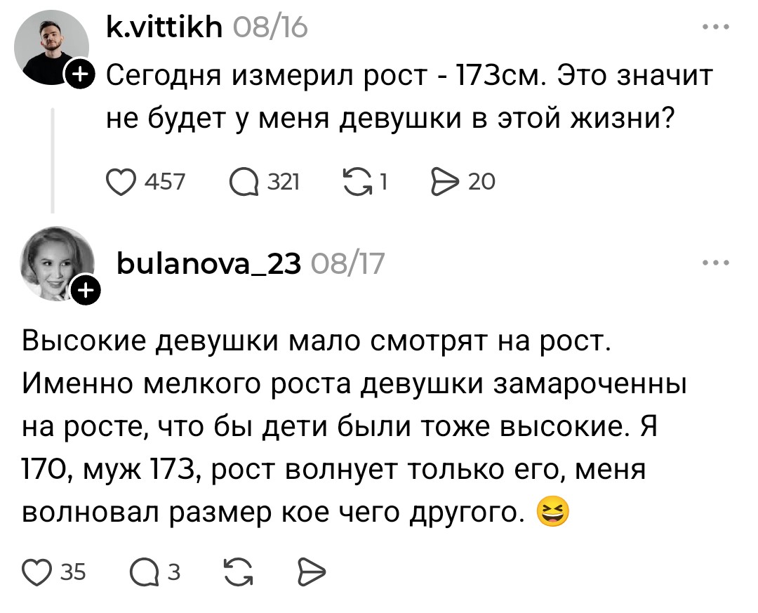 >>10439241 с тобой расставались прям вот из-за роста? >>10439244 зачем мне мнение любой рандомной бабы, меня должно волновать только мнение свой бабы, а ее все устраивает, как и меня