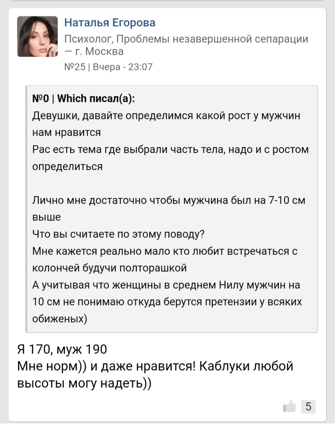 >>10438567 Она на полном серьезе будучи 170 относит себя к высоким? И даже так ее кун выше ее, с точностью до см написала 173. Я сам любитель высокобогинь 180-185+, так им тоже важен рост, на сз пишу что 190, хотя на деле 188, так тян палят и говорят что я не 190.