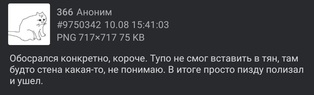 Тот момент когда заходишь в обед воскресенья в шлюхотред и понимаешь что все кормят шизов. Потому что настоящие шлюхоходы в воскресенье проводят время с семьей и детьми. На крайний случай у шлюх. А остальные не выкупают этого и кормят долбаёбов с полотнами пасты. Реально в тред можно в субботу и воскресенье не заходить даже.