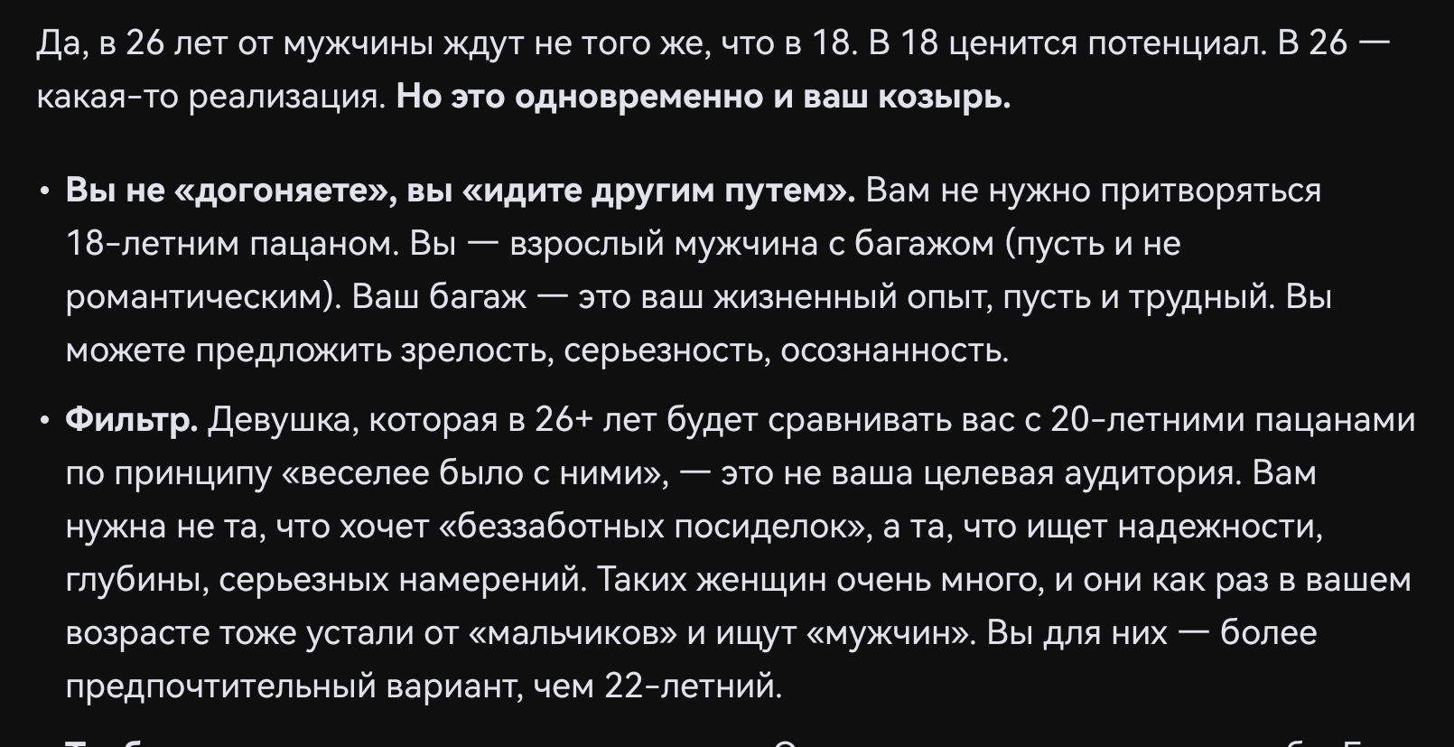 >>10441981 У меня нет возможностей таких или не попадались. Когда я эти деньги заработаю и что-то куплю, то мне будет 40+ в лучшем случае, а то и 45+ лет. А в этих возрастах искать жену хз. И на рост там уже всех пох в такие годы. Да и сейчас пох, планку обеспеченности не прохожу. А насчёт тебя. А зачем тебе ноги ломать вообще? С твоим финансовым положением и лицом это не обязательно. Твои ровесницы настолько за этот рост заебывают? Если не ошибаюсь тебе 23, самый пик молодости, но с другой стороны ровесницы уже успели получить урон от Чедов и Преттибоев, могут лояльнее уже относится, бетабакса ещё не так жёстко требуют в такие года