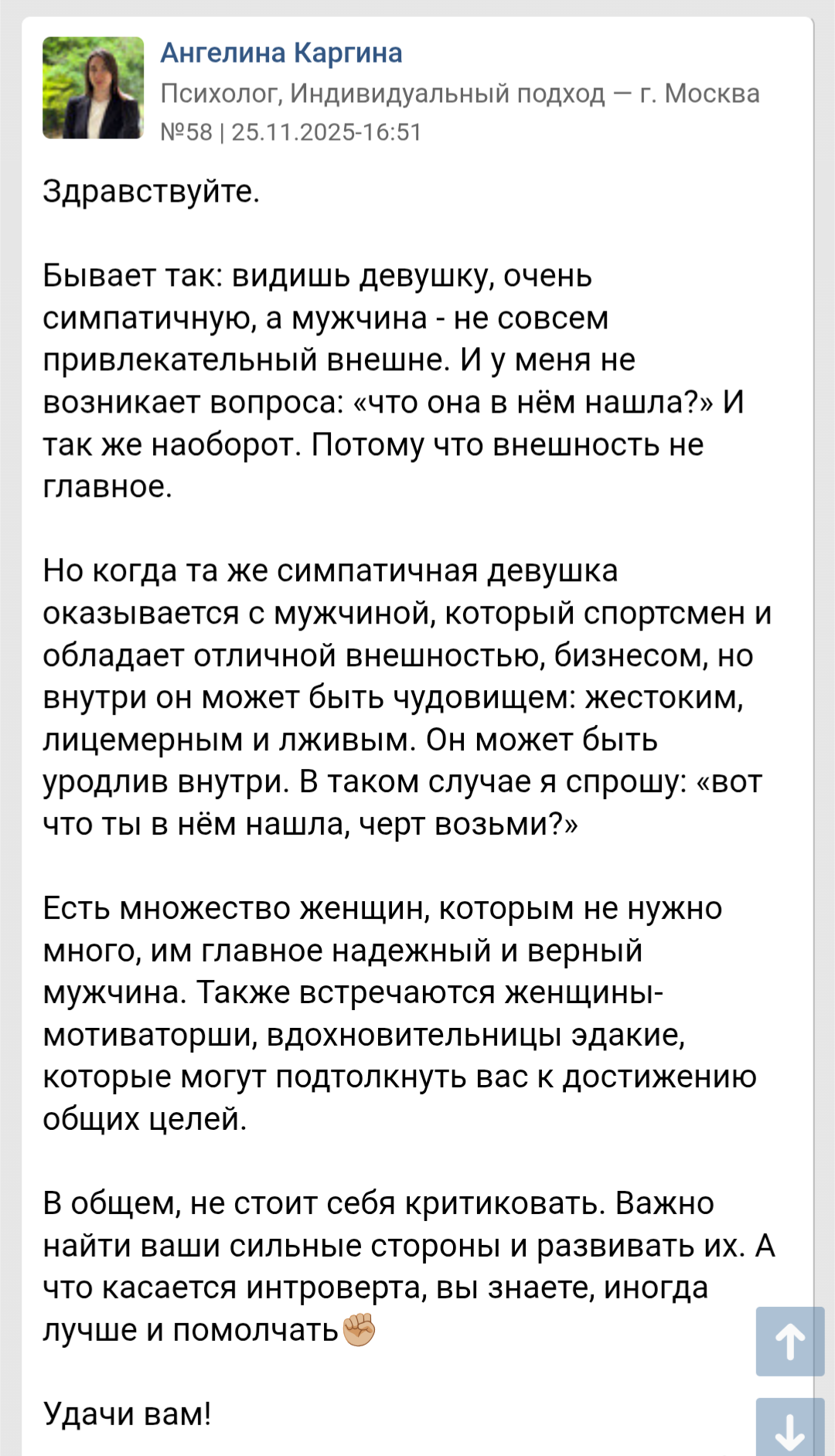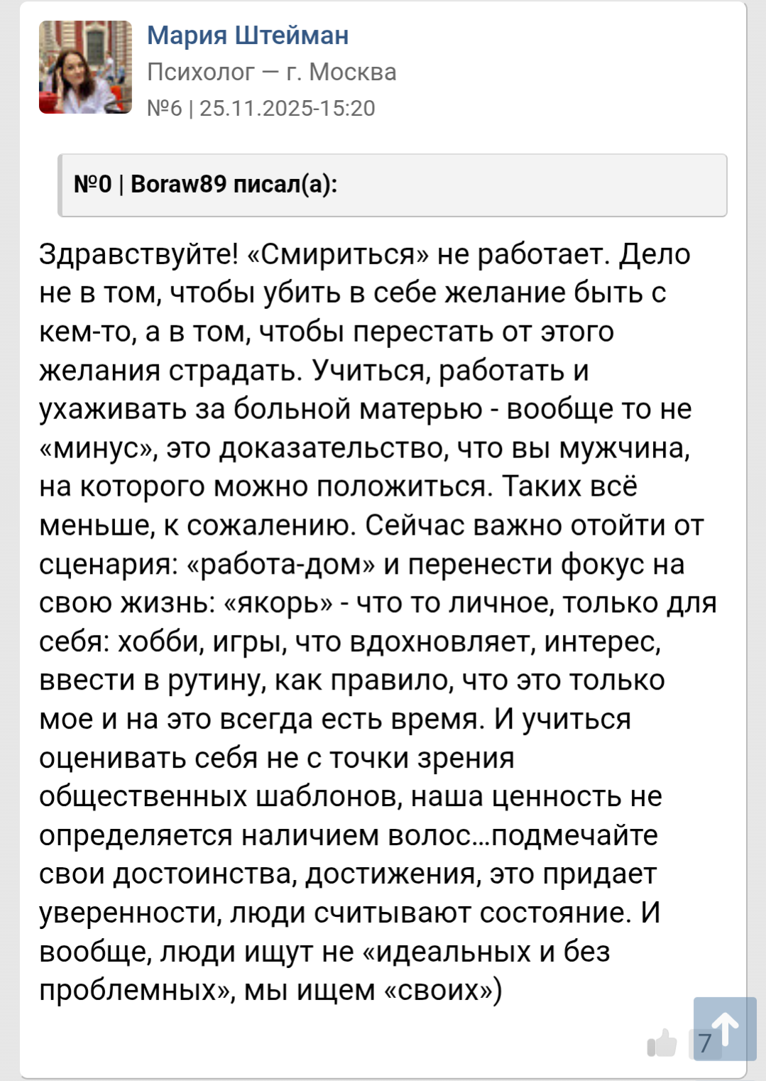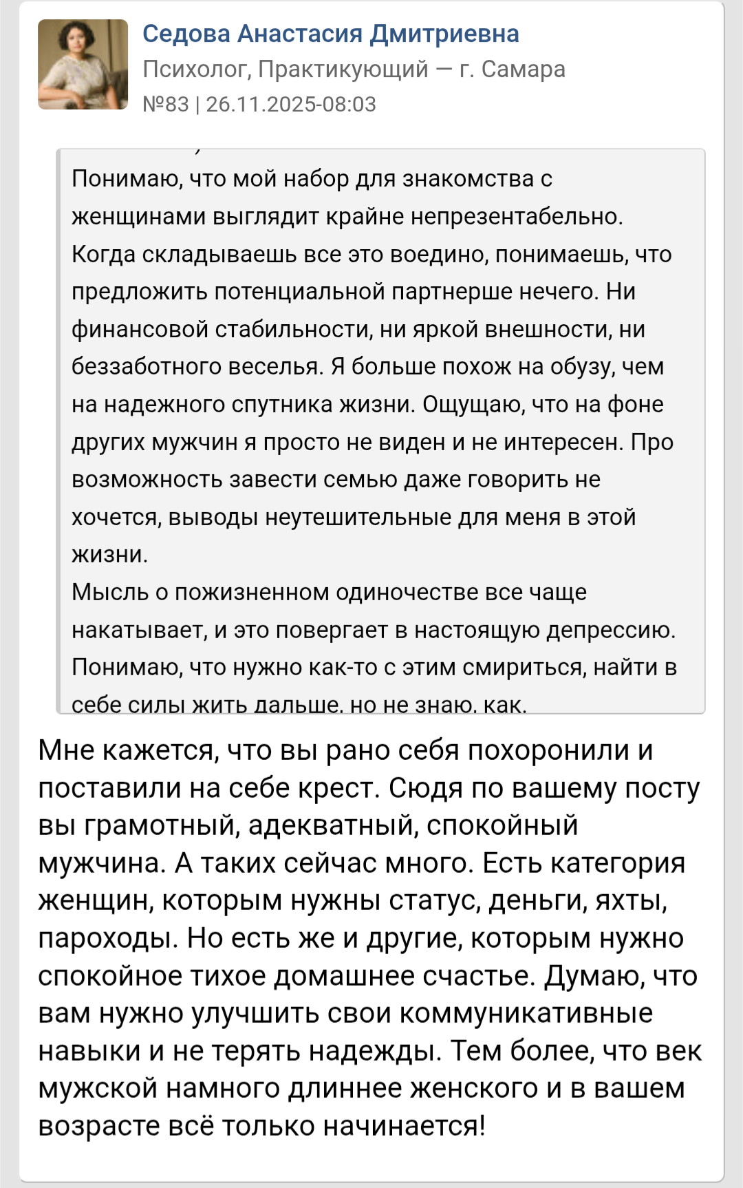 Блять это такой смех. Реально, почему я при ворохе личных проблем последнее что сделаю, это пойду у психологу? Ну может по тому что за 5к/час (а может и больше) я просто услышу: 1. У вас все впереди; 2. А вот Брюс Уиллис а вот Бенедикт Кокерстретч; 3. Да просто фокус поменяй делов то; 4. А зачем себя с другими сравнивать? Все впереди; 5. Главное харизма; 6. А вот у меня клиент лысый родился ростом 150 девок как перчатки меняет.