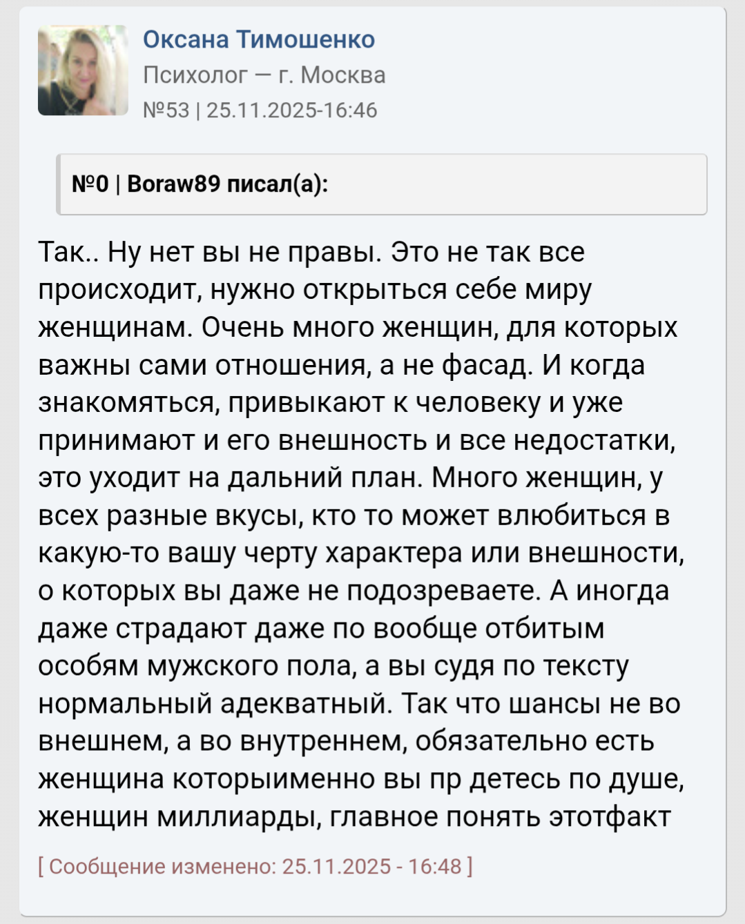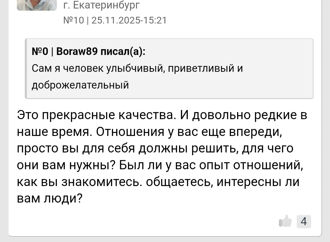 >>10441954 У меня вышка заочная есть по которой не пошел работать. Курсы массажа для себя прошел, поработал в свое время на пару дно работах, на права сдал, но тачкой забыл как водить. Сейчас учу английский, учил язык программирования, но решил выучить тестирование, короче айтишка. Хз уже полгода учу, пробовал в одну компанию, отказали из-за английского, поэтому сейчас учить начал больше. Но я хз, если не получится то хз чё делать, у меня сейчас постоянной работы нет, вообще разочаровался, чисто так на автомате делаю это все. Ну и качаюсь стабильно 2-4 раза в неделю чтобы с ума не сойти. Бросил бухать и курить, чтобы не стать конченным алконавтом, а то уже раз попал в наркологичку после жёсткого бухалова, чуть не отъехал. После этого бросил и начал жимцелить, учиться. Но тянок даже это отталкивает, что не бухаю, пару тянок так отказали из-за того, что просто не пью. Ещё 30 лет не хочу, никогда не представлял себя 30 летним. А тут люди на фотках с отношениями, все отлично, не скитались по жизни, все стабильно и нормально, а я в почти тридцатник начинаю все то что другие в 20 начинают, думать за будущее, за хату, тачку, отношения серьёзные и тд Бля ещё надо научиться плавать, так и до сих пор не умею. А у тебя сейчас работа есть, хоть и дно, но ты можешь свободно куда то идти, рисковать, штормить те самые бары и клубы про которые выше писали другие >>10441967 Мне дать стабильность, достаток и я буду счастлив, а тебе дать рост и ты будешь счастлив. Каждому свое нужно для счастья, но одно знаю точно - мы в этом треде не из-за хорошей жизни. У всех общая проблема - невостребованность среди женщин. Причины и следствия у каждого разные, а в некоторых общие.
