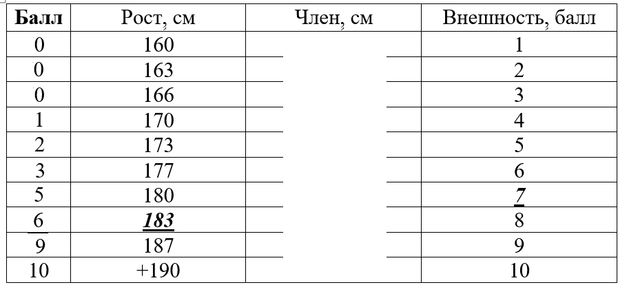 товарищи инцелы, ловите систему балльной самооценки куна, разработанную кандидатом наук просьба перекатывать в следующие инцел-треды * таблица имеет опен-код, я её состряпал за 2 минуты, поэтому нужно учитывать правило внешка>рост>хуй (как в закрепе) + при нижних значениях строк (до 3 баллов остальные параметры не важны) у кого есть желание - доведите до ума К писал, что член не важен - а вот и важен. Т.к. уже на 3 свидании надо ебаться и от тебя убегут с мелкохуем меньше 12см