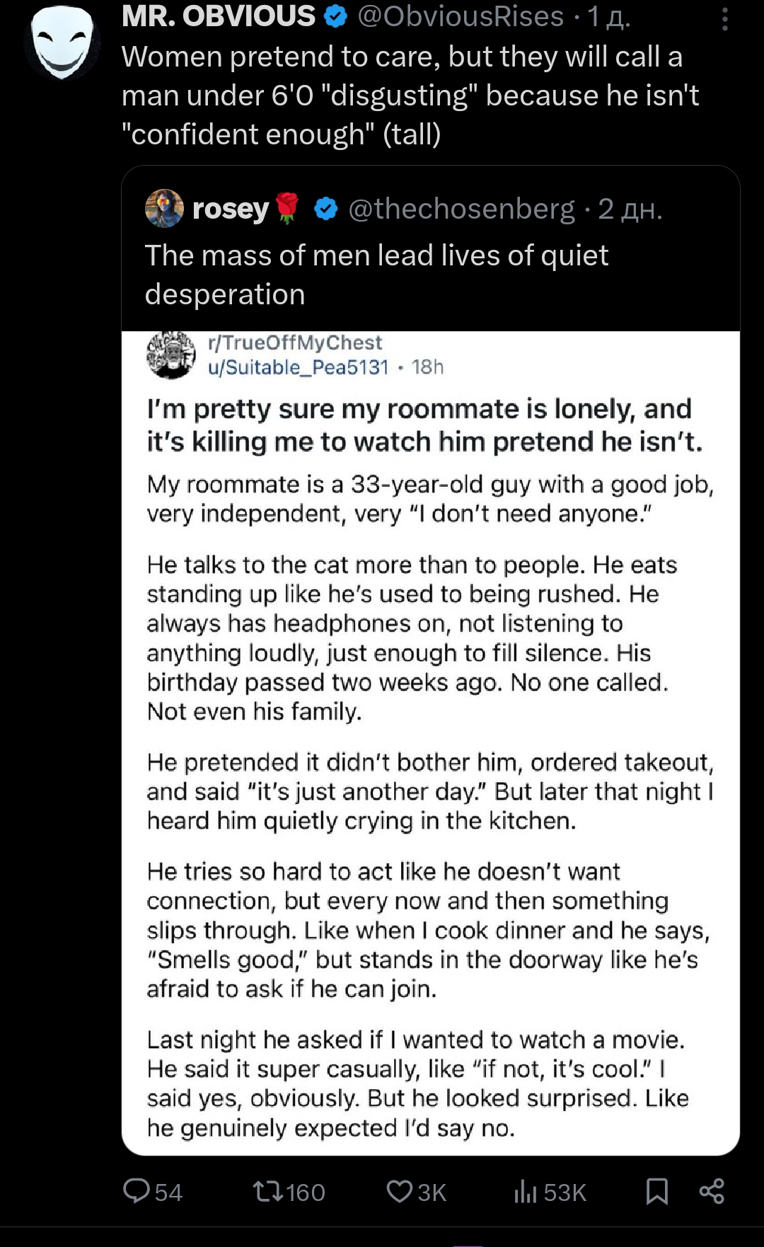 >>10442041 >куча нормисов вокруг с обычными еблами и тянками Жизнб клянусь, что не коуплю и не выдаю желаемое за действительное, но это буквально не так. Из приятелей (4 человека) НИ У КОГО нет бабы. У двоих из них - не было никогда, как и у меня, возможно, тоже девственники. Где не работал, даже среди скуфов-заводчан (про которых все говорят, что У НИХ ВСЕ ПО-ДРУГОМУ ОНИ ДО СЕКСУАЛЬНОЙ КОНТРРЕВОЛЮЦИИ ВСТРЕТИЛИСЬ РЯЯЯ) нет баб, максимум - в разводе после заебавших вусмерть жен, отдают бабло на алики, а про молодежь я вообще молчу. На последнем месте со мной пятеро парней работали, из них один женат, второй не вылезал целыми днями из сз, пока интернет не попячили в городе, но успеха так и не имел. Остальные сидят дрочат, коупят, что им И НЕ НАДО, лол. Реально какая-то хуйня с мужским одиночеством. Я сам раньше унывал, что я додик, хуже всех, а щас вижу, что это уже и среди нормисов массовая эпидемия.
