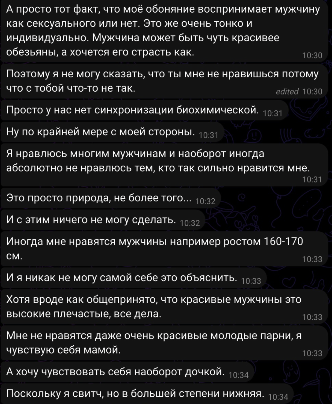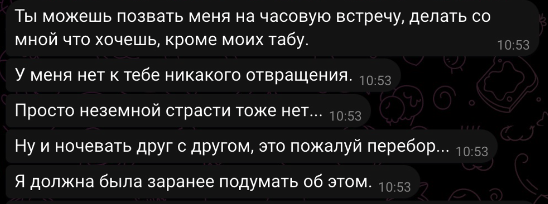 >Встречи только в формате GFE. >СУПЕР ВАЖНО: >Если вы оцениваете половой акт только как механический процесс или не любите тискаться, то ПРОШУ РАССМОТРЕТЬ ДРУГИЕ ВАРИАНТЫ АНКЕТ >Целуюсь >При взаимной симпатии Хех.