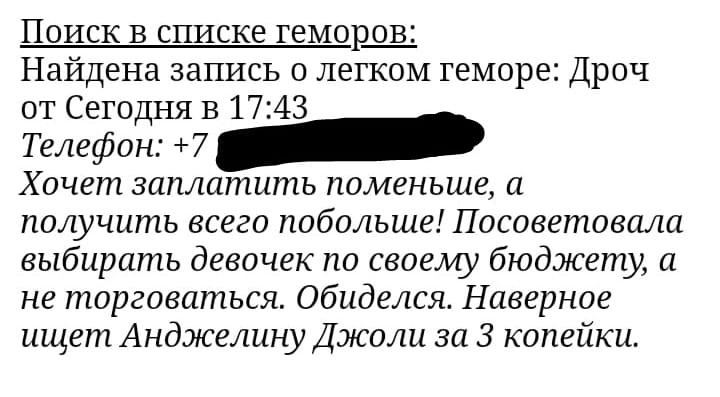 Все, что надо знать о шлюхах: "Идеальный гость это..? Тот который не смог приехать, но все-равно отправил 100к за встречу." с ТГ шлюхи.