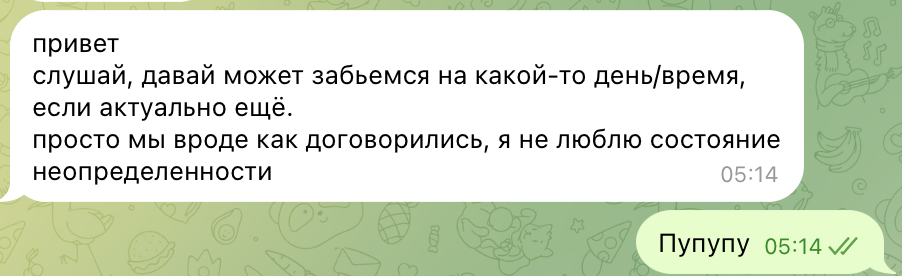 Наверное в этом секрет, у меня лично такой опыт, что просто договориться встретиться, без лива, без какого то выноса мозга, без того что я что должен уже, сложно.