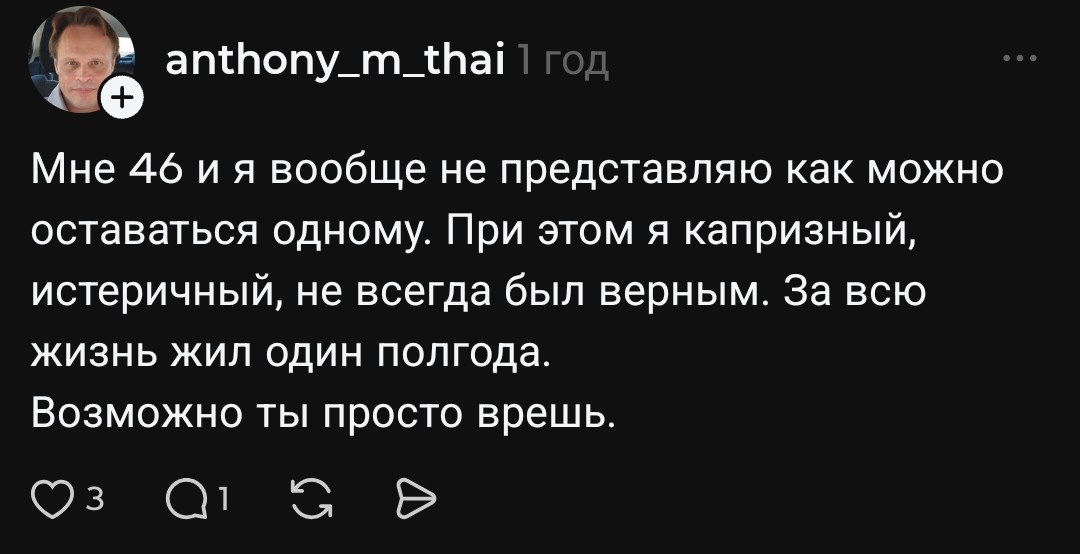 Мужику 42 года, большую часть жизни был алкоголиком. Юность припала на 90е-2000е года. Рост 172. Тянок дохуя было у него по молодости. Вот что значит жить до эпохи сз и массового интернета.