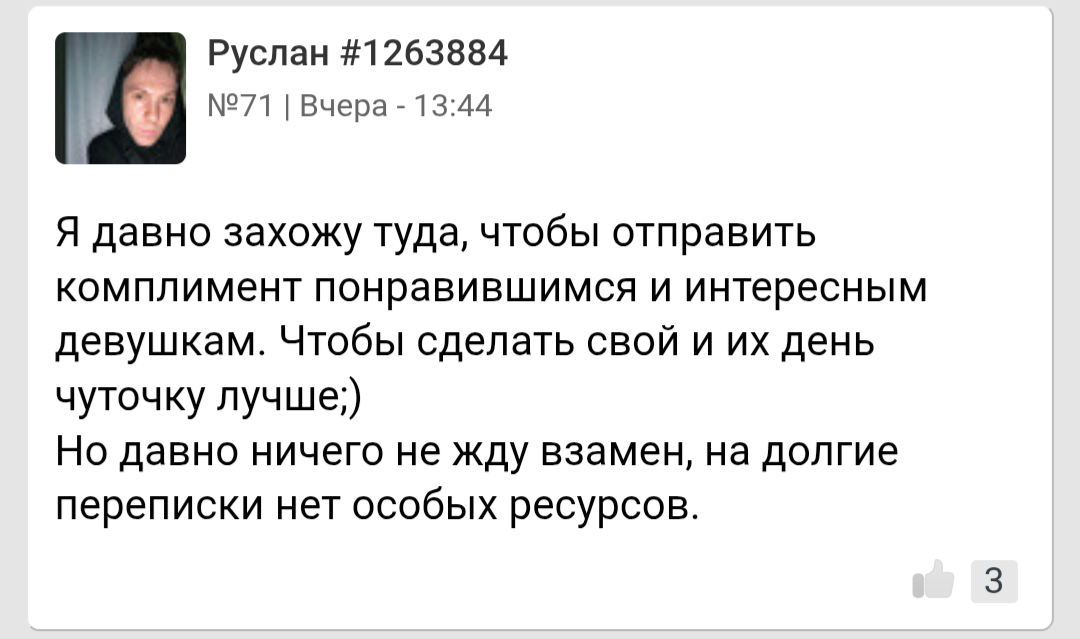 >>10452035 Реально, вот почему селедки не могут нам писать комплименты, какие мы сильные, красивые, успешные, чтобы сделать день чуточку лучше Там ведь только такое: а мужики остались настоящие? Где вы? Одни маменькины сыночки! Если ты не Генри Кавел, можешь не писать мне!