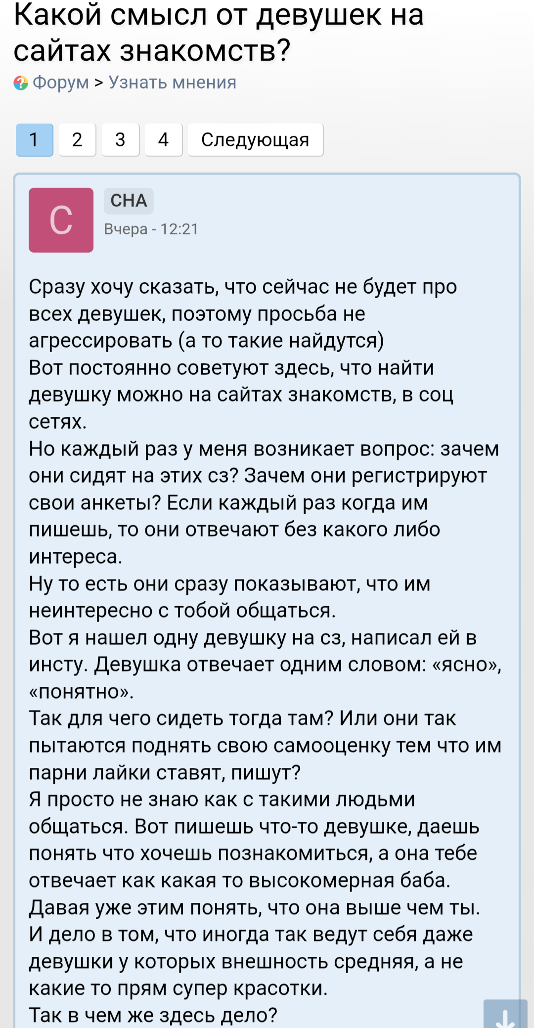 Вы все сретесь? Лучше посмотрите как выглядите со стороны, когда по 15 сообщений без ответа написываете. >>10452630 Да, дропай. Когда хочет реально встретится, то дел нет, либо говорит конкретное время. >>10453951 Перекатывайся в вк. Нахуй тебе симка ради дв? >>10454868 Ну я тоже считаю, что адекватная баба, с которой можно и отношения строить, если и зайдёт на сз, то долго там не просидит. Либо удалит, либо найдёт хороший вариант.