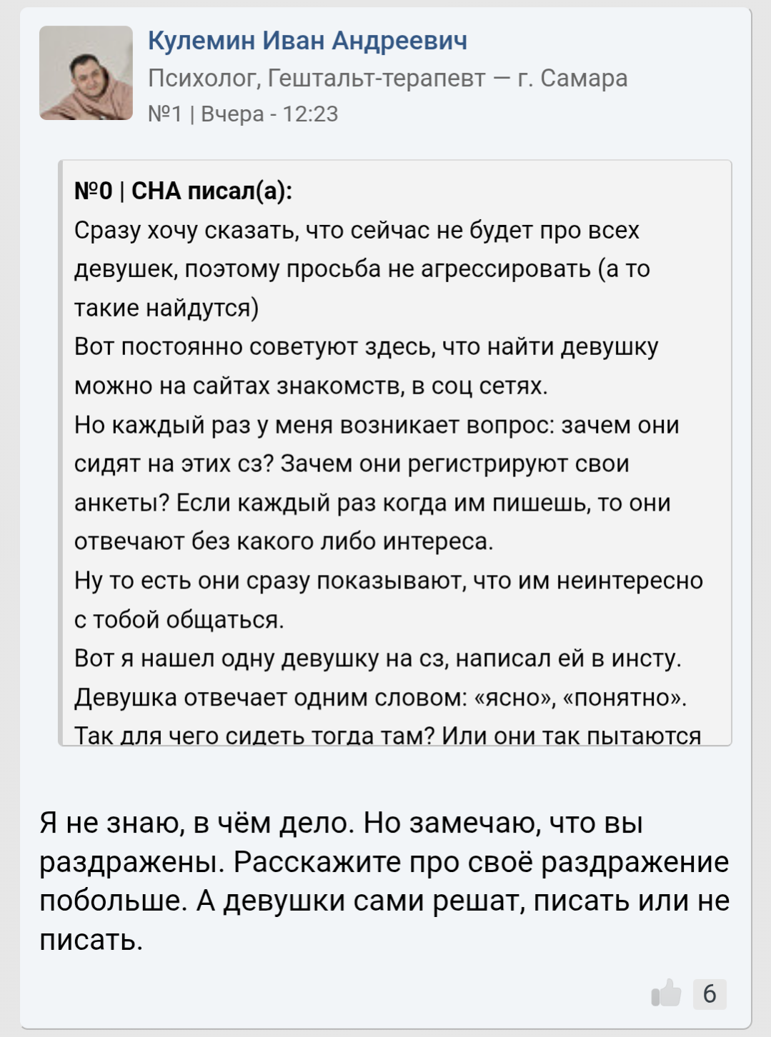 Я уже и сам захожу максимум раз в день. Мало того что лайков нет уже, так еще и те что есть сливаются через 3-5 сообщений. А те кто в итоге вытягиваются на встречу сливаются после нее. Так уже около года, с очень редкими исключениями. Начинаю ненавидеть тянок, а это вообще уже нихуя не продуктивно