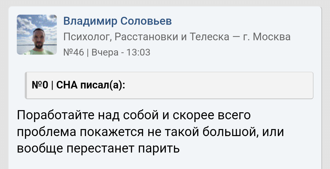 Поскольку здесь периодически пытаются устраивать филиал инцел-треда, к любой полученной ITT информации следует относиться с поправкой на местную аудиторию. Не забывайте репортить инцелошизу и просто шитпостинг (да, это работает). Анал_огично, если видите в треде очередное "я простой парень, сразу зову баб к себе и трахаю по 10 новых баб с СЗ каждый месяц" или что-то в этом духе - погуглите, сколько у среднекуна половых партнеров за всю жизнь, и подумайте, насколько вероятно то, что какой-то pizdobol na dvache набирает ту же стату за месяц-другой.