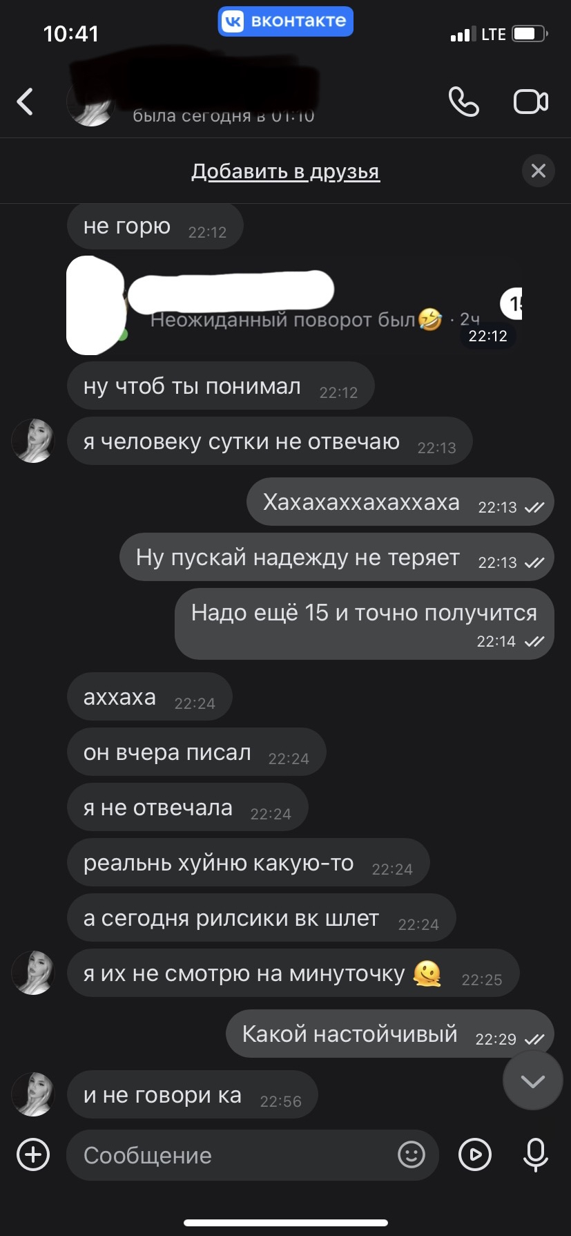 >тянка забанила тг - нашёл её из ирл, спустя месяц пишу с вк с другой фамилией Нахуя это делать?