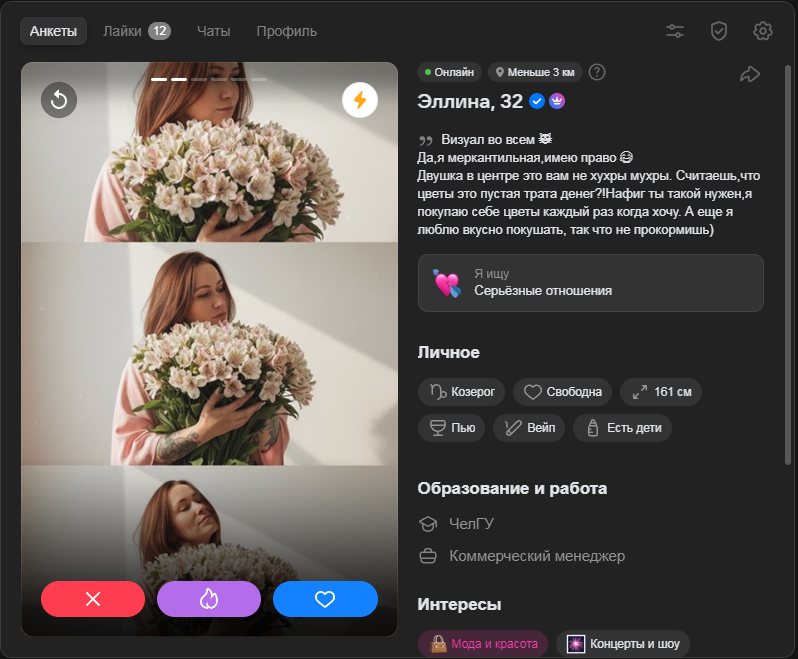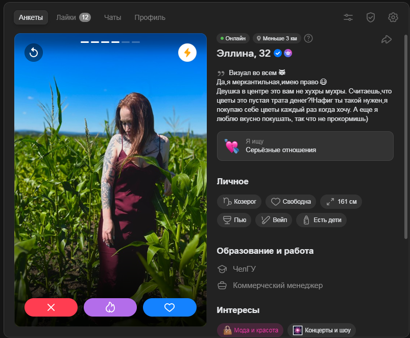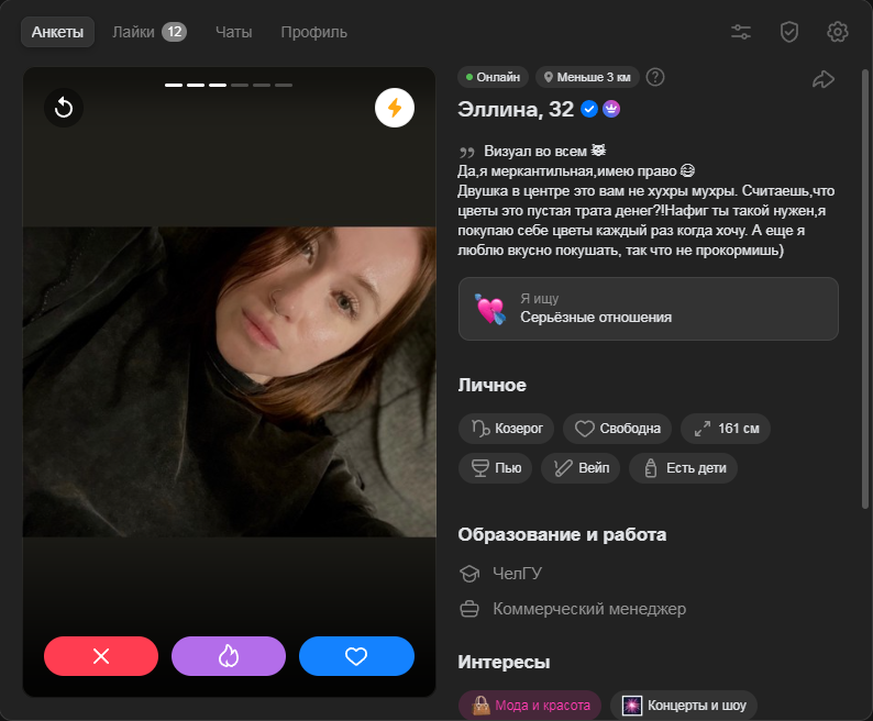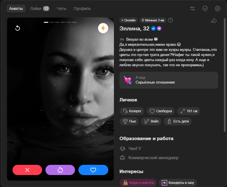 Какой положняк по дайвинчику? Сижу в нем в миллионнике и странная вещь: одни и те же анкеты падают, хотя я до этого их пропускал несколько раз. И самое главное мэтчей нет, хотя полистав там анкеты особо и не хочется кого-то лайкать, а кого хочется 1% анкет, то там и явно шансов на мэтч около нулевой. По итогу меня лайкают тян, которых я и не видел в списках своих вообще. И что самое интересное, бывает 1 лайк прилетит, потом второй, на след. день может третий, а потом просто тишина недельная и вот так волнами какими-то.