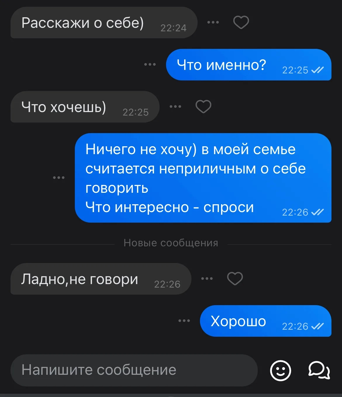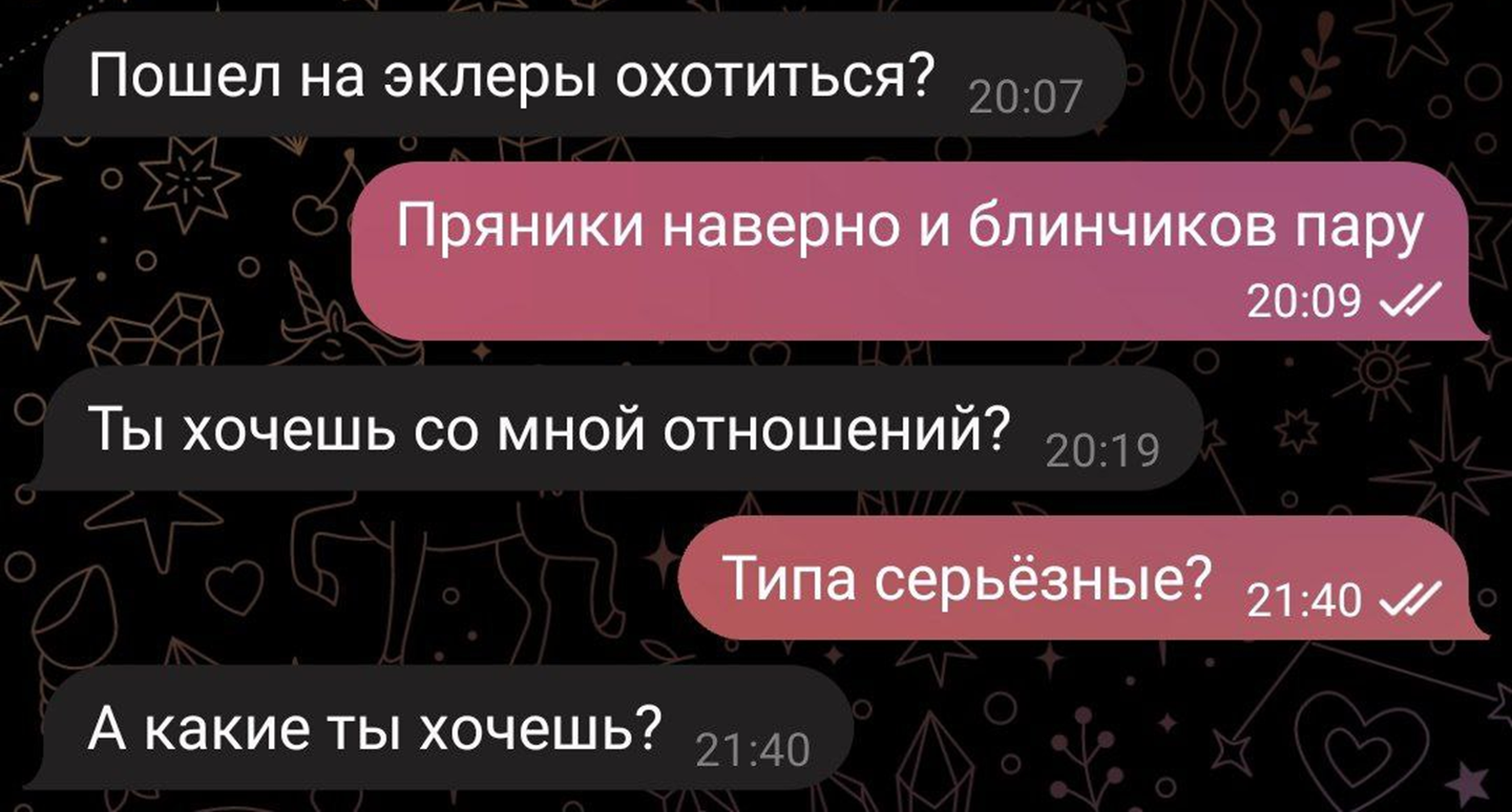 Начинаю диалог с "какие у тебя психиатрические диагнозы?". Если ничего то удаляю чат у обоих. Если что то интересное вроде бар, прл, шизофрении, то играю в русскую рулетку написывая всё что у меня в голове без особых раздумий и тряски. Потому что на ебанутых не работает блекпилльная теория про рычание тазом и хваток за жопу на минус первом свидании в семизвёздочном ресторане после созвона.