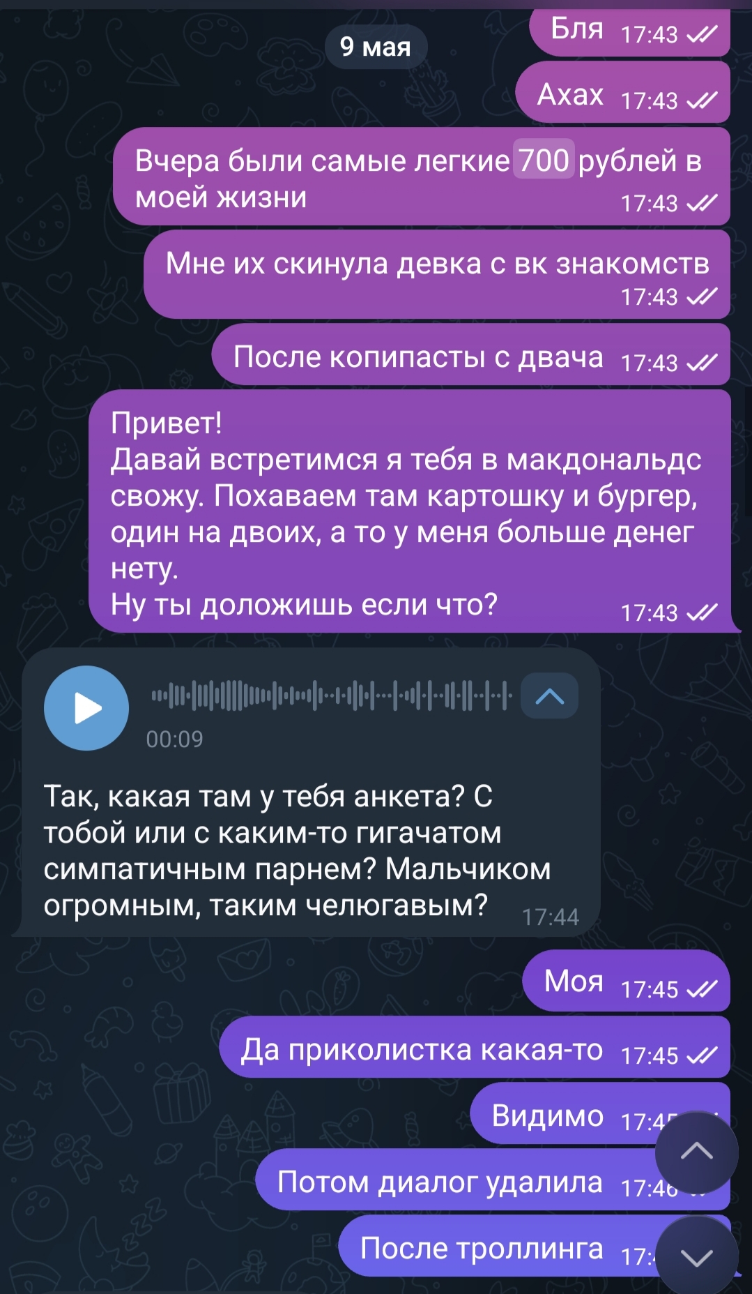 1) Был 3+ года без отношений и набегами высаживался на СЗшки, в частности ДВ и ВК Знакомства. В тот момент уже было ощущение, что там везде тупые пезды (за очень редким исключением) с идентичными фотками и описанием, буквально анкеты Ctrl+C, Ctrl+V. Даже впадлу было смотреть на их ебальники, поэтому было принято решение нахуярть лайков всем подряд и плясать уже от готовых метчей. Когда в результате данного мероприятия они начали появляться (около 10-15 штук накопилось за день в дс2) встал вопрос что им писать. Недолго думая начал всем пездам кидать ту самую копипасту про мак, картошку и бургер на двоих. На выходе часть тянок не выкупали, кто-то просто хихикал и отшучивался, парочку проявили готовность накормить меня во вкусе очка за свой счет, но одна переплюнула все мои ожидания. После пары наводящих вопросов она попросила номер карты и скинула мне целых 700р, а прошло всего минут пять с начала общения. Видимо дохуя сильная и независимая, решила самоутвердиться за чужой счет. Мы потом в тг перекатились, мне чет неловко было – я ведь думал она рофлит, когда номер карты просила, поэтому был готов все вернуть назад. Но она не сказала куда возвращать бабки, лишь вкинула, что вот "люблю кальян курить, как-нибудь пойду в заведение, а мне вдруг не хватит деняк счет оплатить – тогда поможешь". Я чет в итоге начал над ней прикалываться с этой ебучей оплатой кальяна, писал про двойное яблочко и кумар – она в итоге удалила диалог. Но я бтв с первого взгляда на анкету понимал, что дальше диалога с ней не хочу ничего строить.