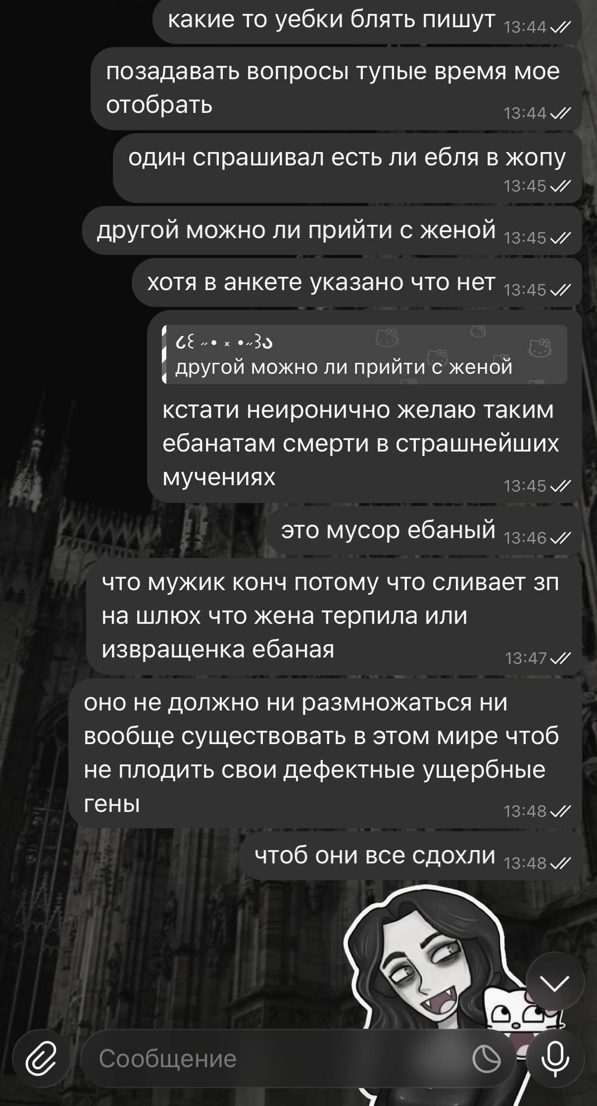 >>10454895 Чушь. Просто всякие порватские каналы постят такие примеры, когда хачу досталась тян. Полчища хачей-инцелов они не постят. Более того в их странах как правило лютый вагинодефицит, хуже чем в России, хотя козалось бы куда ещё. >>10455003 > Если ты слово селедка через слово используешь, зачем тебе женщина вообще, тем более жена тебе не нужна. зависай лучше со своими братками или кто там у тебя Проигрываю, когда все ледки пытаются страумней чуть говоря, вот если ты не любишь женщин, то зачем тебе женщины вообще? Ну типа "ебись с мужиками ахаха" Я тебе сейчас открою секрет, но мужчины вообще не любят женщин, не только инцелы. Как кто-то на форчане пост писал, типа, я" со своими братанами могу обсуждать темы, которые женщины никогда не смогут поддержать и скорее даже меня высмеют за то, что я их обсуждаю, потому что, мол, это слишком обскурно. Буквально во всех аспектах компания братанов предпочтительнее женщин, кроме одного: у братанов нет пизды". Я с ним не совсем согласен, потому что все-таки у женщин помимо пизды есть еще другие привлекательные части тела, но суть в принципе правильная, именно как собеседники или деловые партнёры или в принципе люди, мужчины практически всегда предпочительнее женщин, хотя бы потому, что они к тебе не относятся по дефолту как говну,просто потому, что у тебя челюсть недостаточно большая, не считают что ты им что-то задолжал просто по половому признаку и т.д. Это применимо ко всем мужчинам. Не один из твоих парней тебя никогда не любил. Он тебя терпел и кормил общением просто потому, что он был вынужден это делать, чтобы получить доступ к твоей пизде, сися, ножкам и так далее. Может быть он, конечно, даже сам себя убеждал, что ты якобы до хуя интересный собеседник, потому что человек всегда стремится свои действия как-то себя оправдать хорошими мотивами, рационализировать и так далее, если он только не психопат ебаный, да, и ему бы самому, конечно, было приятно, если бы ты действительно была хорошим человеком. Но суть-то всё-таки такая, что вряд ли бы они с тобой общались, если бы у тебя не было пизды.