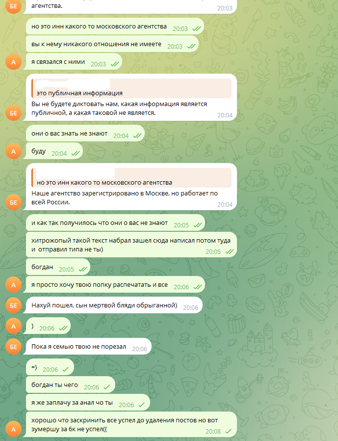 Ну что анон. Вы мне не верили думали я смсщик. А я... трахнул сочную зумершу за 6к с поцелуями и мбр и овр и аналом за 3к... правда в мозг) В общем на днях я тут рекламировал агентство шлюх и легендарные презервативы но в этот раз не буду. И обидно мне как то стало что а вдруг меня и правда пытаются наебать... не люблю когда меня наебывают. Знаете там когда к шлюхе пришел на два контакта а после оргазма ты потом ну что продолжим? А она такая ой а у меня один контакт. И уходишь с чувством наеба даже шлюху не выебал ведь ты скорострельнул от минета. А если доплатить то секс уже как будто хуйня и вайб не ебливый потому что тебя наебали. Ну или банально фото не соответствует а кого то искать уже на хуй и ты ебешь шлюху за 10к которая выглядит на 3к... Так вот. Человек я еще душный как видите если читаете этот пост) люблю во всем разобраться прям конкретно так а если загорелся то вообще иду до конца. Ну и тут я решил с сочной зумершей перед встречей пойти до конца и все выяснить максимально чо по допам и как будет наша встреча проходить. Пикрелы что из этого получилось. Сочной зумерше начал писать всякие неприличности про анал вылезать мне попку и как ее попку распечатаю и накакаю туда... И знаете эта зацикленность на анусах + гомофобия у наших славянских народов так сказать вызывает наверное бугурт когда кто то их в жопу выебать хочет ведь обычно они хотят. Если про мужиков речь идет... а сочная зумерша видимо ШОК это зумер. Видимо у него подгорело и он начал помимо своей жопы бомбить меня с нескольких акков и даже с того самого бота где по идее только заказать можешь а писать нельзя. Смски он конечно же потер все и забанил но в целом я доволен своим расследованием)