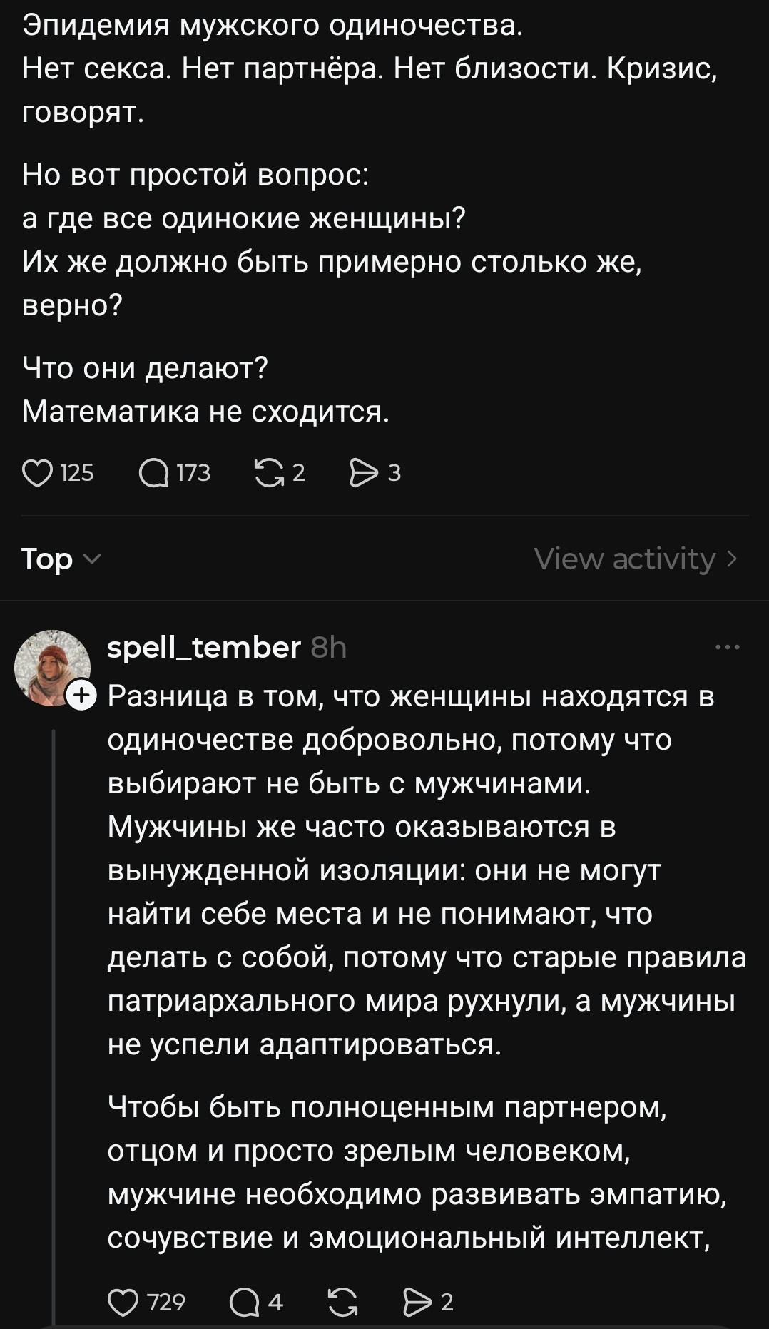 >>10461238 Точнее, мужчин в параде планет каждой сельди стало настолько много, что от переизбытка их тошнит кислотой и актуальное на орбиту в 5-10 чушков "Меня никто не любит, я так одинока" меняется на "Кто не насильник - тот педофил, не хочешь поесть со мной в ресторане на 50тыс. - готовься сесть по обвинению в домогательстве" при 20-50 тел. Дальше только хуже >>10461068 С аквамена проорал, спасибо. Толковое определение лучка-жимцела, клеящегося к тетям сракам на двадцать лет его страше >>10461224 >>10461238 Не ты ранее постил с Б17 скрины? Если и не так, то спасибо, что ты есть, анонче. Ради такого в тред и захожу, всегда сохраняя твои подборки, всё шин