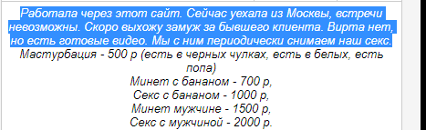 https://b.intimcity.kim/indi/anketa692581.htm Был у неё сегодня принимает рядом с метро единственное что выходит надо кто статуя хо ши мина что бы дойти быстрее было. Комната большая чистая все,тапки полотенца прочая залупа одноразовые шетки все есть. процессу тоже все четко сосет умело подмахивает и тд по параметрам похожа миленькая.единственный минус что когда когда слегка намокает появялется не приятный запах и во время вотрого па он усиливался во время моих фрикций но он не особо сильный так что процессу не мешал.