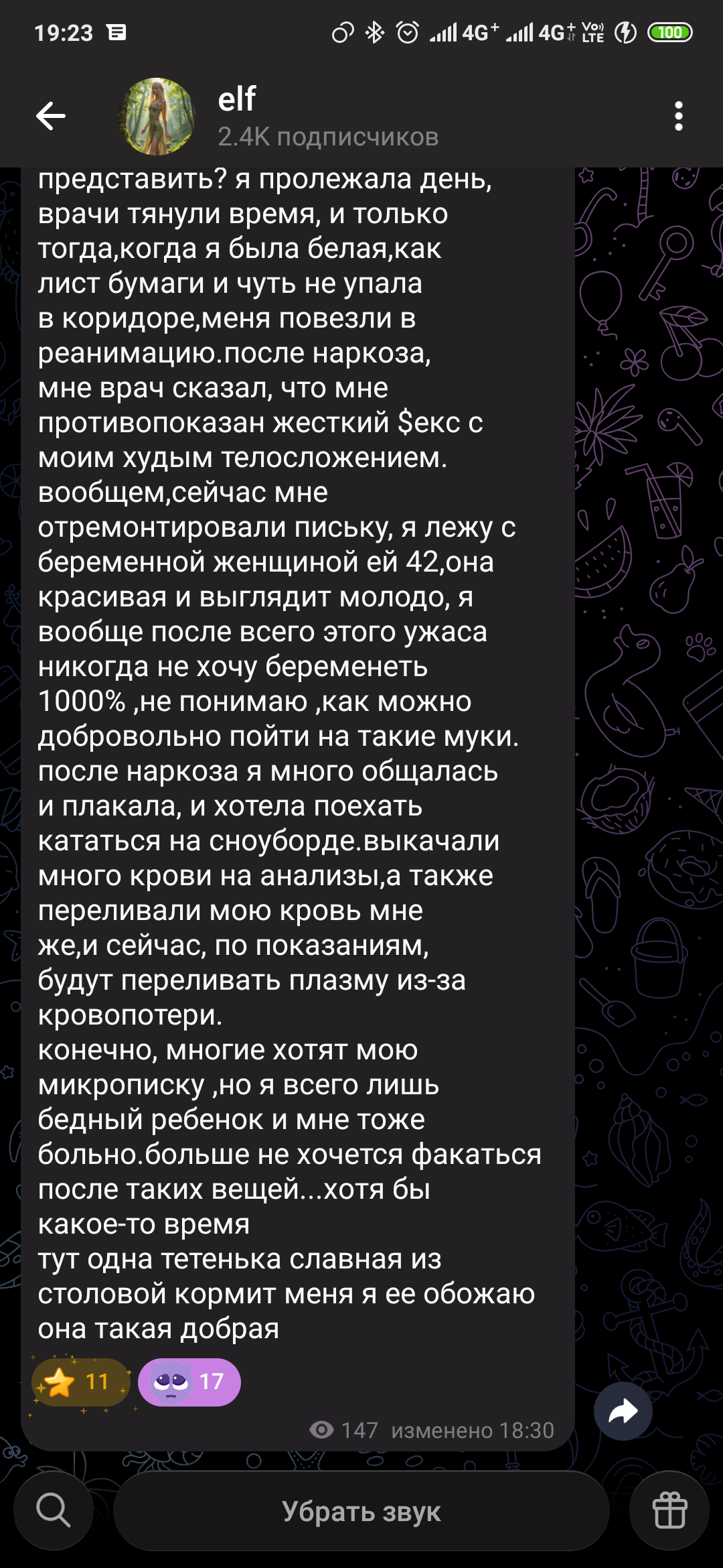 Серунишка пишет что у нее в палате одни пузатые тетки лежат и она с поломанной писькой. Врачи еще думают ремонтировать или нет писку. Она хочет есть и пить а врачи не разрешают