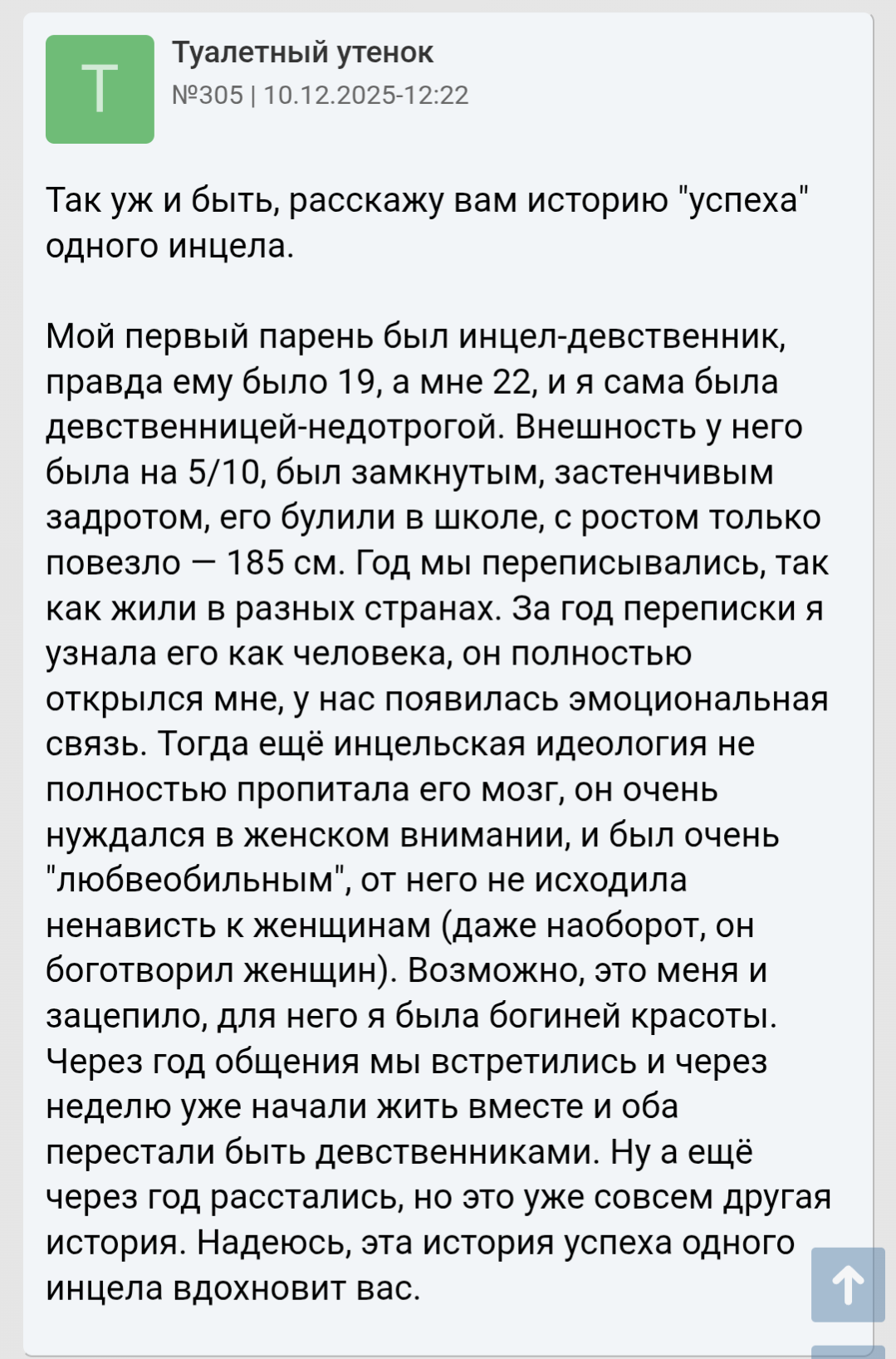 Вы вообще тут ебанулись со своей хорошестью. Вот знаешь ли бывают такие бабы жутко слабохарактерные мазохистки, вечно ищут самого дерзкого самца защитника, а в итоге находит избивающих арбузеров, изменяющих, лудоманов. И вот ей 35 и у нее вся история отношений это кромешная тьма. И ни один более менее нормальный чел ничего строить не хочет с ней. А ей дурочке говорили подружанки, что прекрати хуйней заниматься, хватит самых ебнутых мужиков пригревать, а она не слушала, дурочка. Вот и вы тут все дурачки. Вам говорили жимцелить, луксмаксить, развиваться, а вы себя выше этого ставите, мол чедикам же все просто так, а у меня уважение. Ну и вот вы сидите в этом черном болоте обиды, и никто не захочет давать вам шанс, потому что вы совсем уже ебнутые тут, если вас не смущает шапка треда, и вы не против ассоциировать себя с таким.