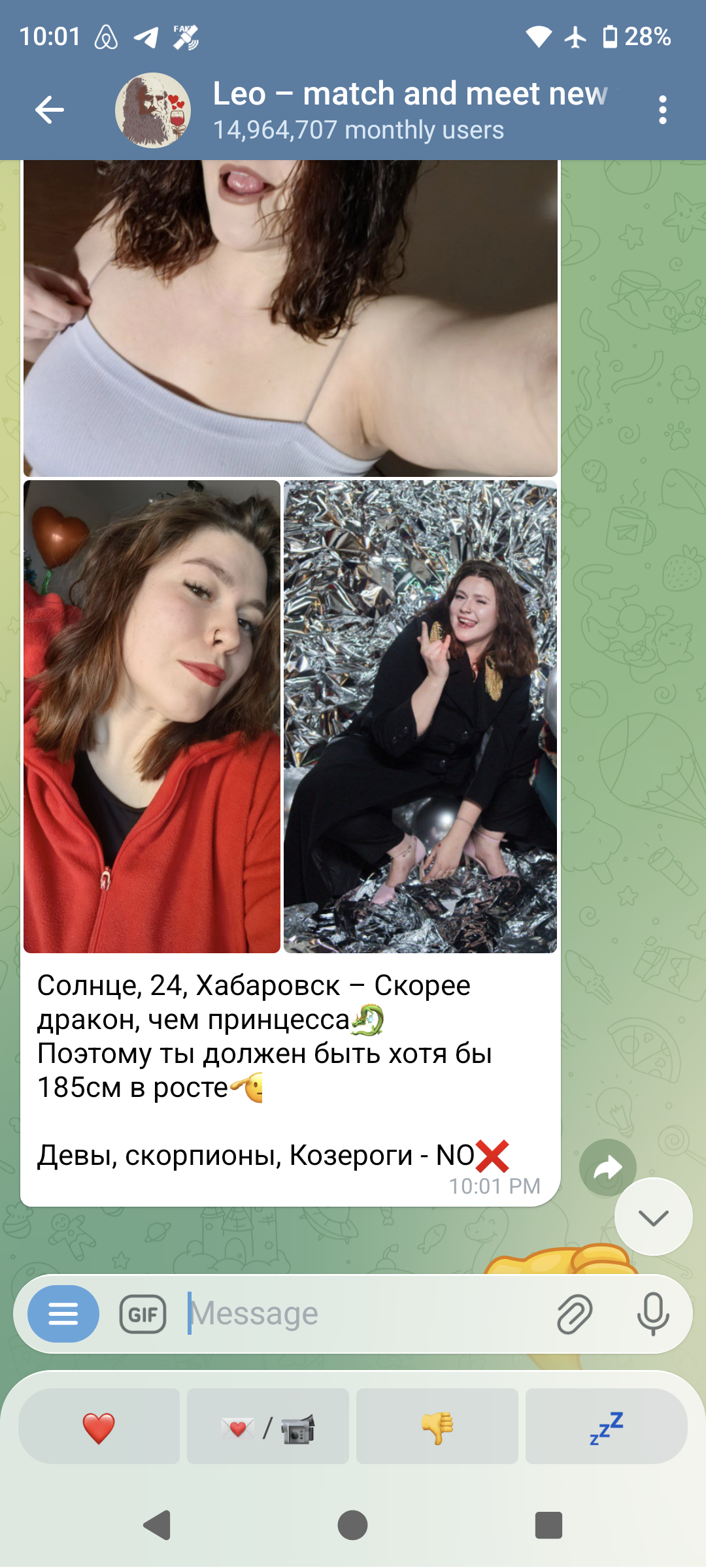 Не открывал дайвинчик наверное уже полгода или год вот открыл опять... это же просто ебанулся > хотя бы 185 Требование, чтобы был ХОТЯ БЫ в топ 5% населения по одному лишь росту. А свой собственный вес эта свинья указать не желает интересно блять??Ну и ещё, блять, отфильтровывание по знаку зодиака, ну потому что а хули нет, когда выбор бесконечный, можно доебаться до чего угодно > замужем > есть молодой человек Сука блять нахуя ты тогда делаешь анкету на сайте знакмоств мразь дегенератская?? Делать анкету на САЙТЕ ЗНАКОМСТВ, если у тебя есть парень, это как к сать мимо унитаза, блять.