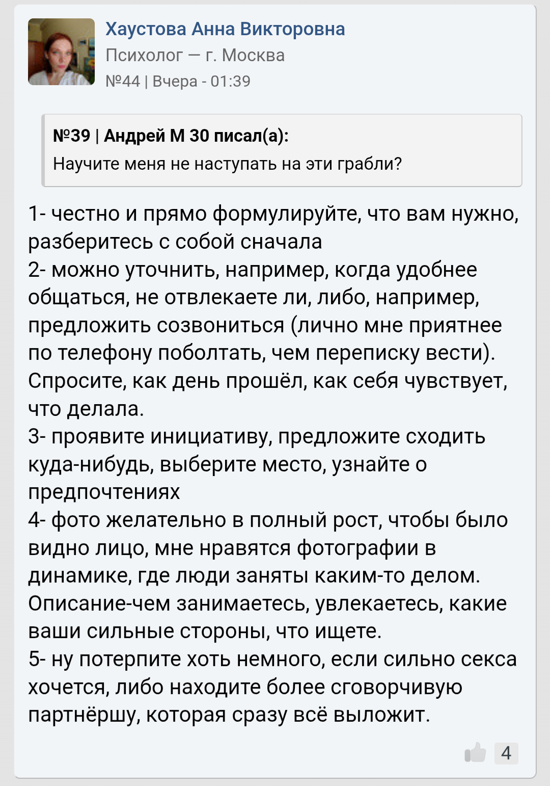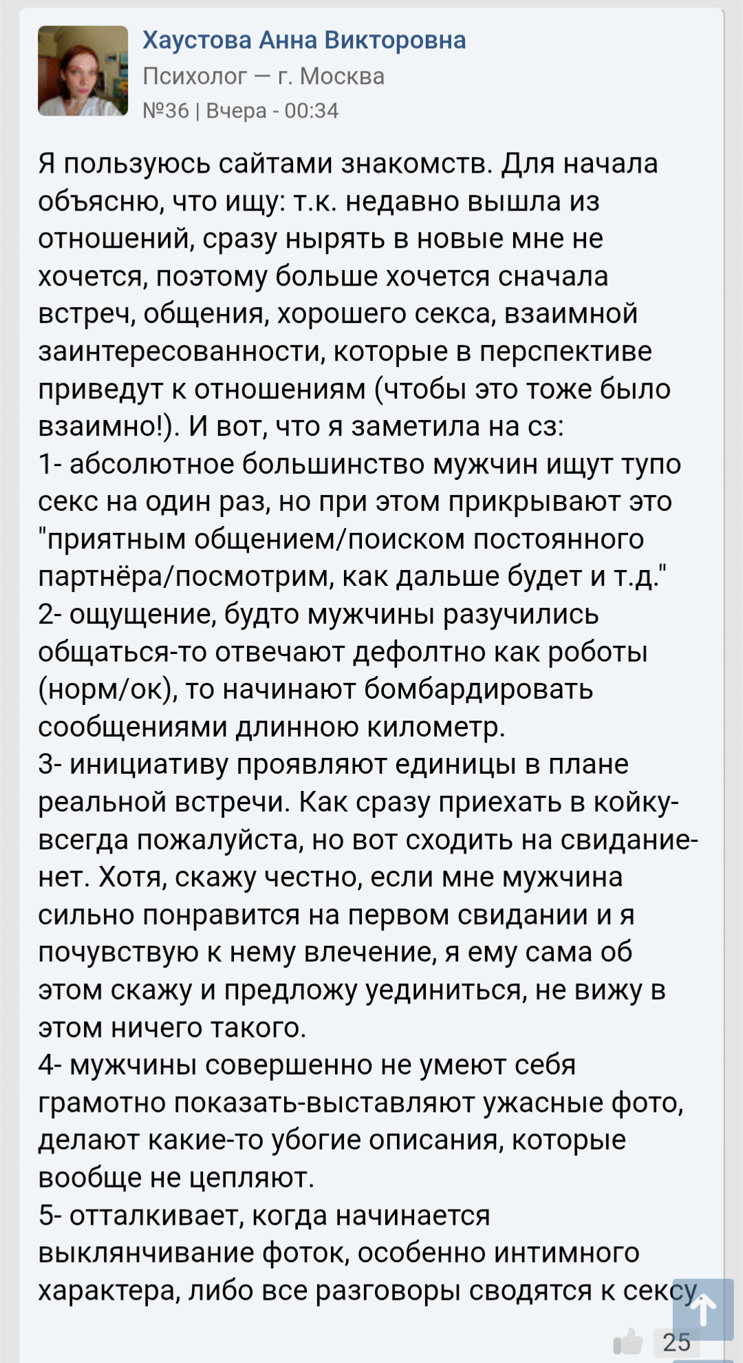 Поскольку здесь периодически пытаются устраивать филиал инцел-треда, к любой полученной ITT информации следует относиться с поправкой на местную аудиторию. Не забывайте репортить инцелошизу и просто шитпостинг (да, это работает). Анал_огично, если видите в треде очередное "я простой парень, сразу зову баб к себе и трахаю по 10 новых баб с СЗ каждый месяц" или что-то в этом духе - погуглите, сколько у среднекуна половых партнеров за всю жизнь, и подумайте, насколько вероятно то, что какой-то pizdobol na dvache набирает ту же стату за месяц-другой.