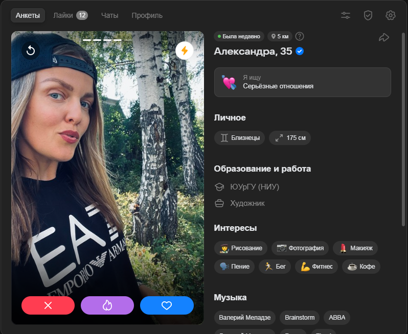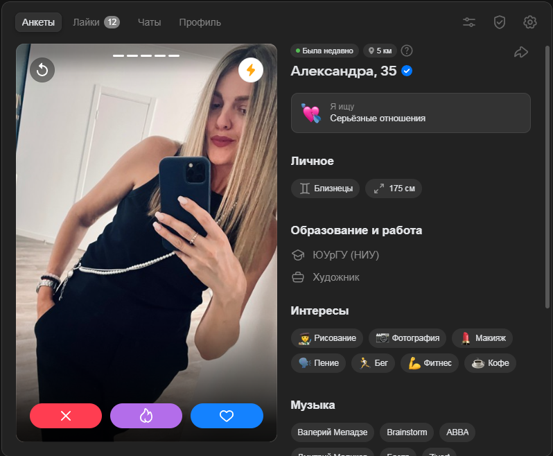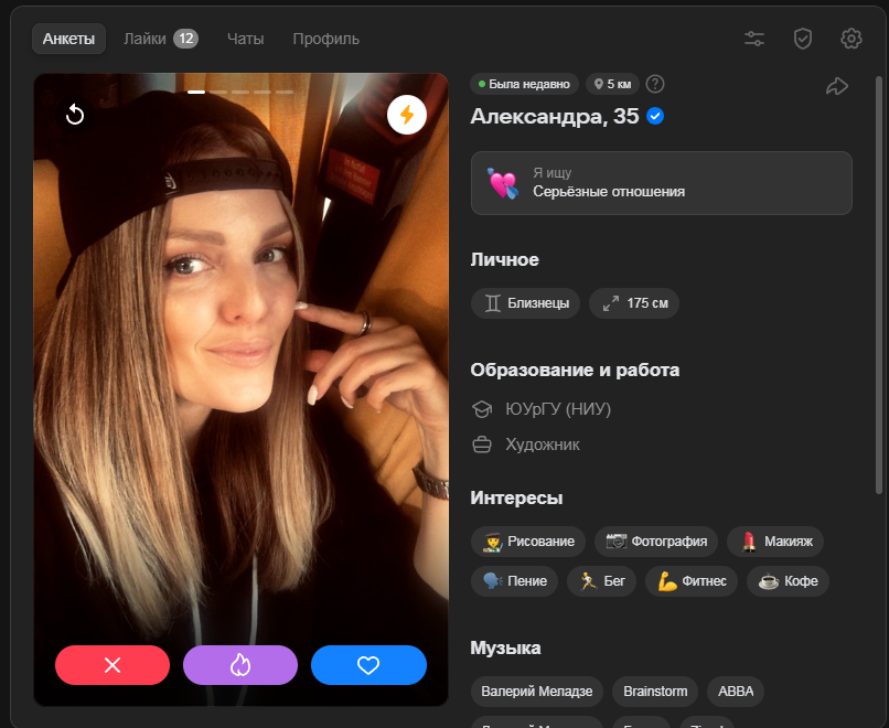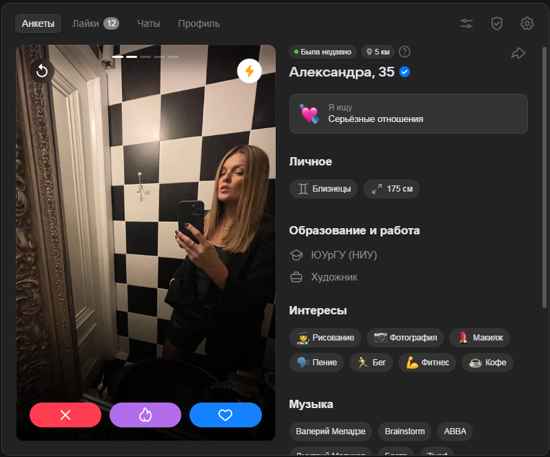 >>10481949 Ситуация меняется, ухудшается. Я скажу так, я сам знакомился так в 2021м. Был акк со средними фотками, моими работами с моей мастерской кож вещей. Бабы и сами писали иногда первые, общение было. Я когда писал то меня отшивали 8 из 10. Как меня находили? Ставил геолокацию из ресторанов когда гулял на корпоративах или сам заходил. Тян чекаои раньше людей по геолокации кто тусуется в её кафешке рестике гостинице и тд. Потом пишут или лайкают. Это было в 2021.