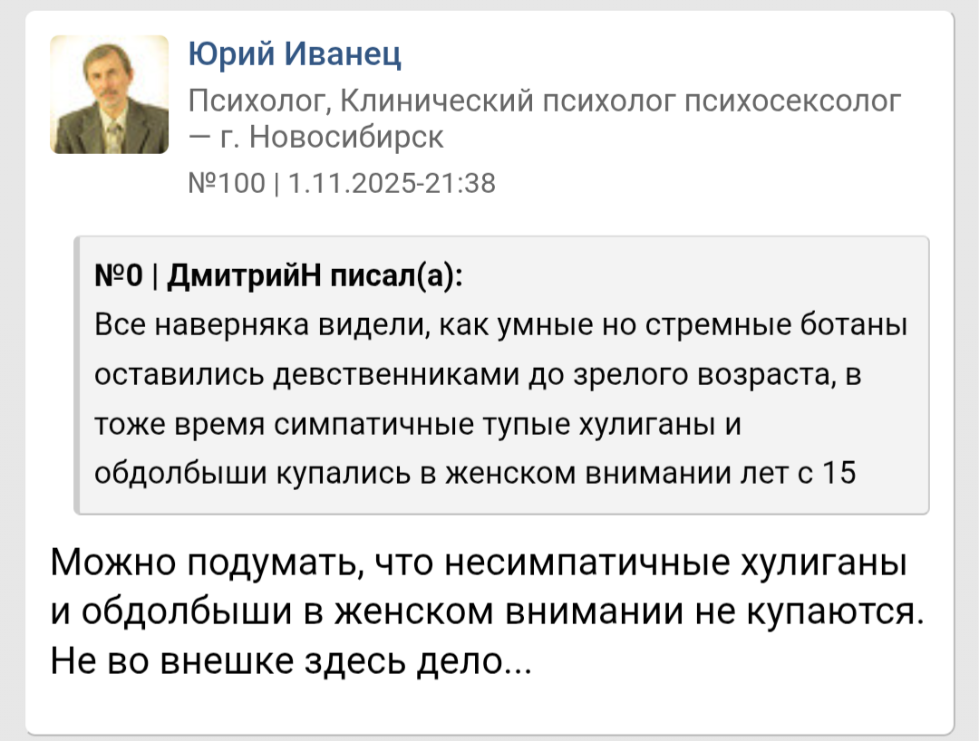 А вообще не понимаю хейта в отношении К. Он всего лишь продукт распространения информации о инцельстве и деградации межполовых отношений. Даже по статистике число парней которым не дают секс растет, естественно многие будут находить информацию о инцелах и попадать сюда. И дальше хуже будет. Уже сейчас инцел в основной массе это не аутист вроде Славика Курбатова или хикка-хуикка который на бабкину пенсию живет, на доширак в неделю живет и раз в месяц моется. Обычные парни без физических уродств, социализированные, с работой и деньгами не могут получить самку несмотря на попытки это сделать. Дальше таких будет больше. "Курс пизды" с каждым годом растет.