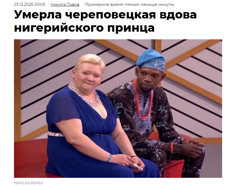 >>10483486 Там такая стори забавная есть. Думаю многие помнят стори про НИГЕРИЙСКОГО ПРИНЦА. Когда бабка из вологодоской области выписала себе негра и сделала от неё каким-то образом детей. При том у бабки был сын русский от первого брака.