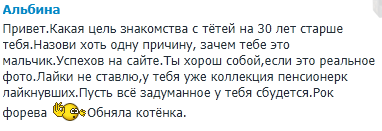 А есть ли шанс на матюрку у маминой корзинки (меня) ? Да и что им писать, о чем с ними разговаривать, как расположить к себе? Написал тут нескольким теткам, типа "Привет, ты прекрасна, я немного младше, но просто горю желанием познакомиться" и подобное. Некоторые даже отвечают, просят рассказать о себе и тд. а дальше у меня ступор, я трясусь и не знаю, что дальше писать. Иногда кажется, что если бы они меня сразу посылали, то было бы проще.