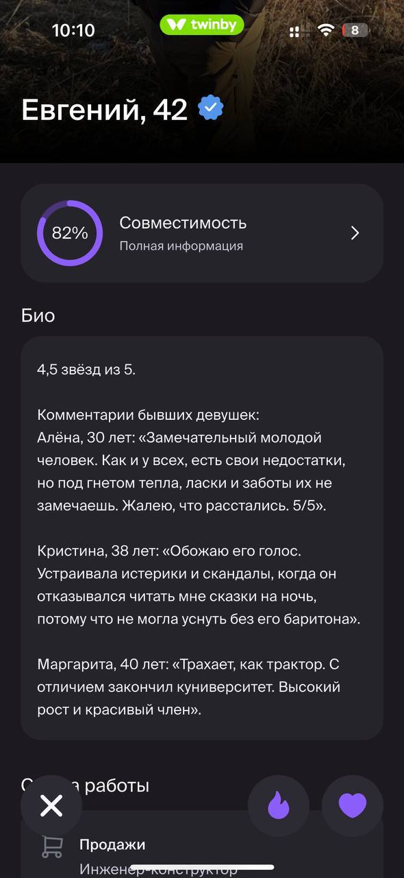 Последний месяц плотно налëг на пьюр и твинби, имея пару свиданок в неделю. Последние пару дней так вообще просвайпал в твинби наверное с тыщу анкет уже чисто шутки ради.