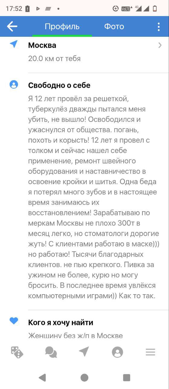Есть фейк анкета из пикчи снизу. На нее упало больше лайков от обеспеченных самок, которые сами путешествуют и имеют стабильную работу, держат себя в форме и т.д Ставил одну единственную фотку с описанием, что работаю вообще, блять, на складе.
