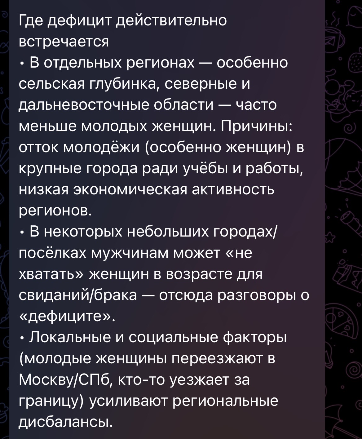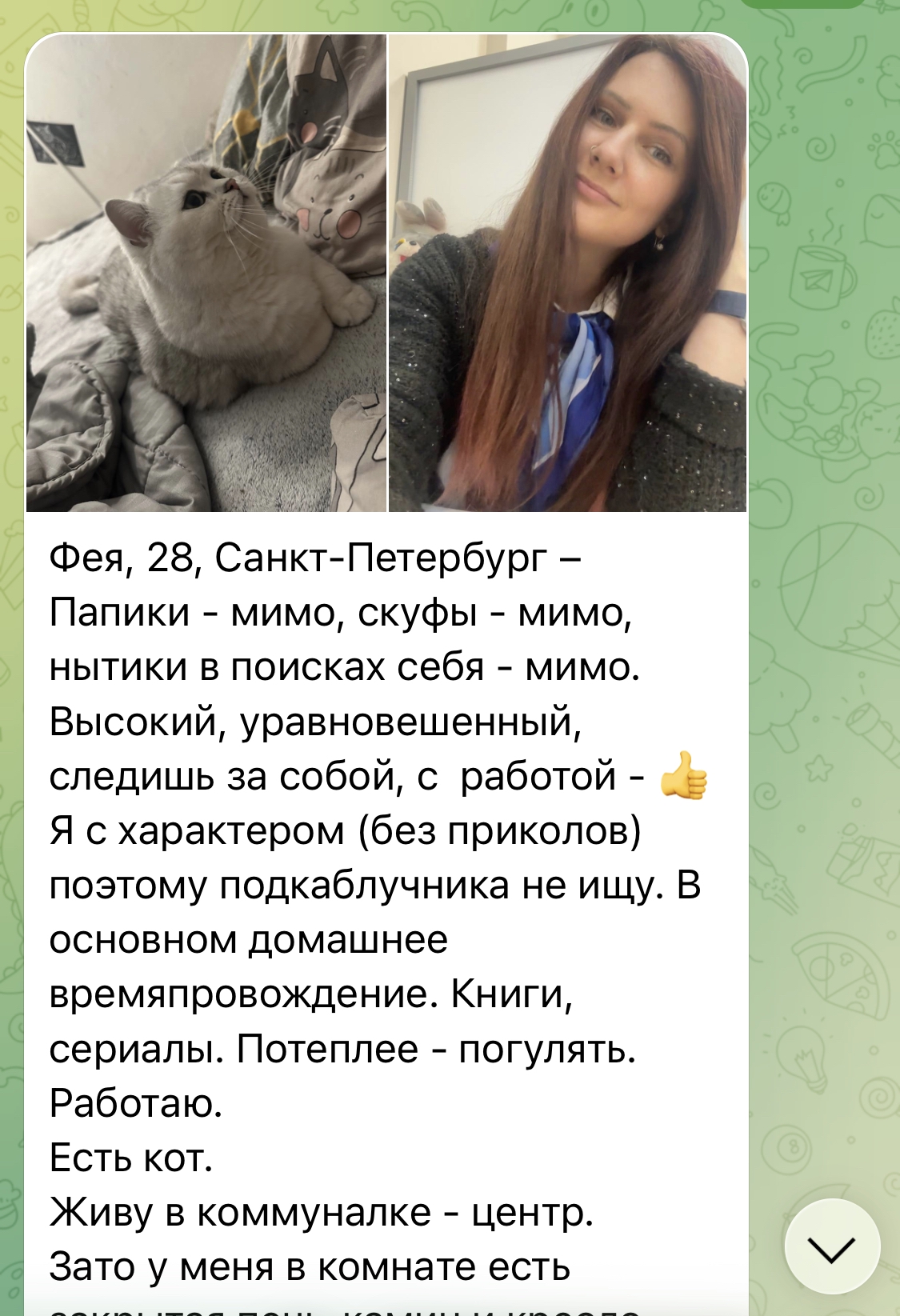 > "Ищу Настоящего Мужчину". Подразумеваются цветы до встречи, "щедрость" и прочий вайб турецких сериалов, про что прямо пишется в био. Детектятся тупо по слову "мужчина". Чаще за 30, но встречаются и кадры до 20 Это сейчас вообще во всех соцсетях. В т.ч. в той же инсте реально каждый второй рилс в рекомендациях - очередная баба (а иногда даже мужик) рассказывает, что "мужчина" (да, раньше было "настоящий мужчина", сейчас уже просто "мужчина", причем это слово начало появляться и в речи тян до 20, которые раньше говорили только "парень") обязан оплачивать каждый пук, заваливать дорогими подарками и не требовать ничего взамен. В тиктоке не сижу, но там скорее всего то же самое. Более того, уже появилось дохера подобных видео на английском (возможно, и на других языках), искать по словам "Slavic Girl".