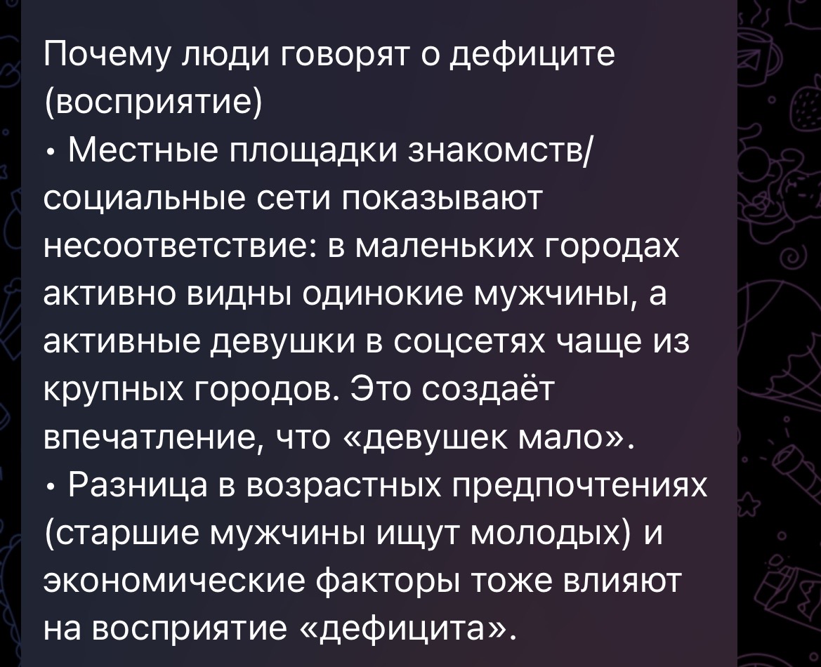 >>10487332 Вот тебе мухосранскому нищуку и ответ, нет никакого дефицита тней, дефицит в твоем колхозе/дефицит в твоей голове тк ты не выходишь из дома, сидишь дрочишь свои сз где реально дефицит тянок и делаешь вывод о всей стране, типичный двощер с двухзначным айсикью не способный загуглить вопрос/спросить у ии.