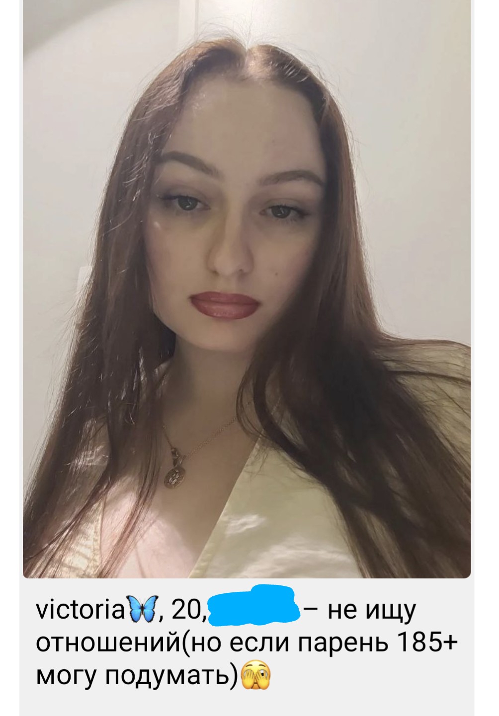 >>10488002 >"Ищу Настоящего Мужчину". Подразумеваются цветы до встречи, "щедрость" и прочий вайб турецких сериалов, про что прямо пишется в био. Детектятся тупо по слову "мужчина". Чаще за 30, но встречаются и кадры до 20. Обычно либо колхоз, либо реже наоборот выходцы из богатых семей, ищущие кормильца на смену бате. Я вот такую встретил>>10487924