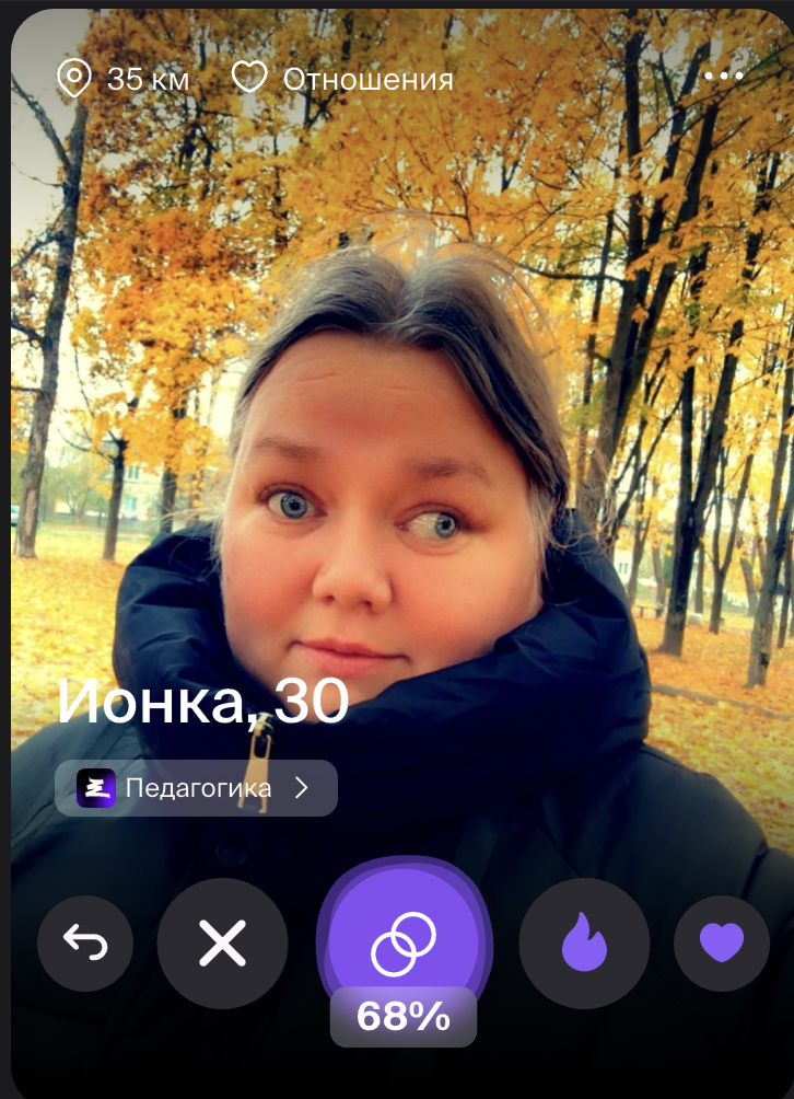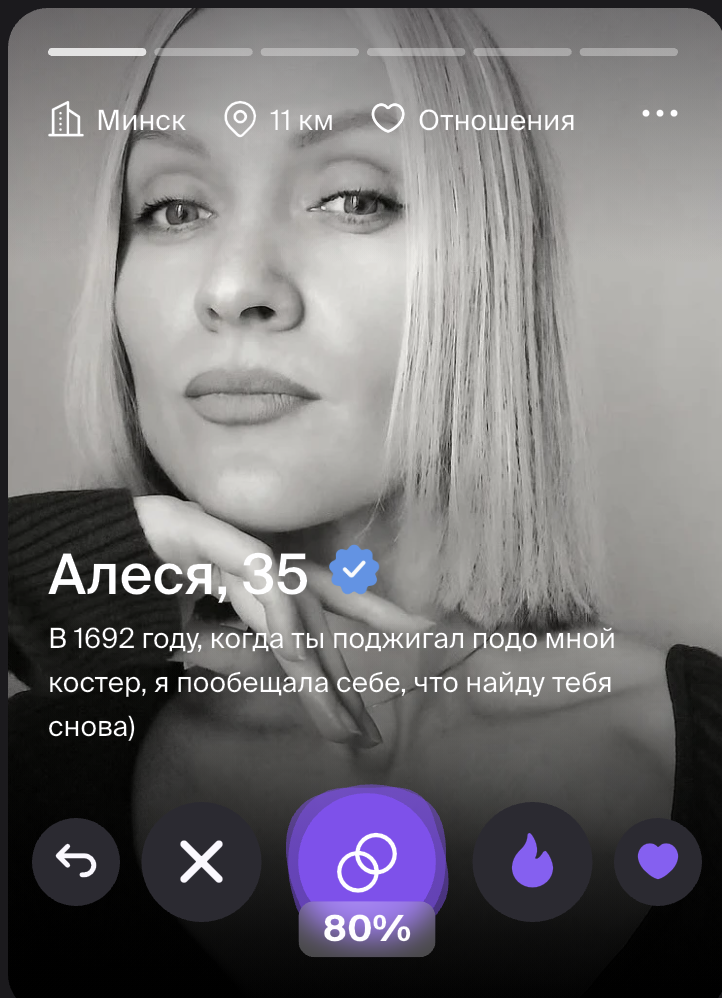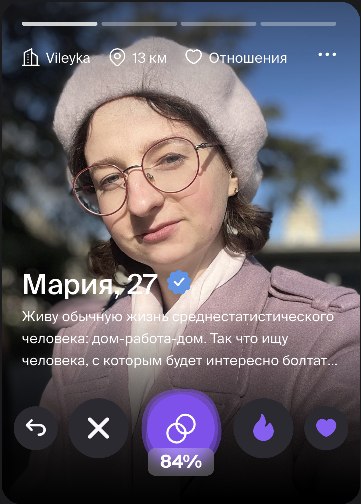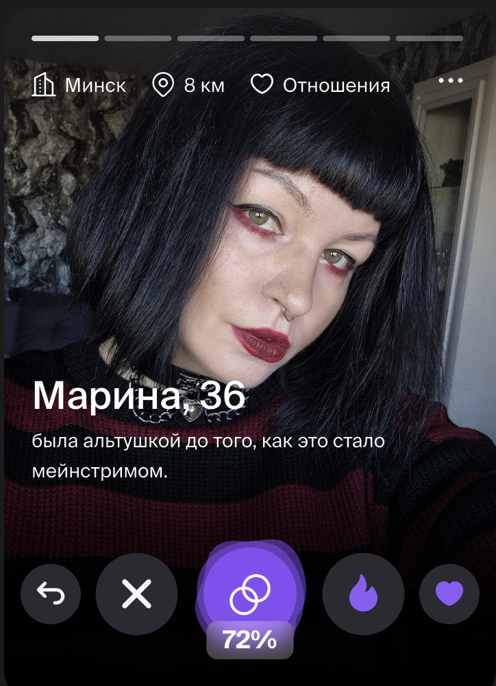Большинство тянок просто одинаковые, с одними и теми же фразами в био типа "хихоньки да хаханьки", с одними и теми же "трендовыми" деталями типа стикера в виде хуя на чехле телефона. 90% лиц затюнингованы в край, я на улице такой концентрации дубайских принцесс не вижу. Цепляет на уровне "классная, хочу познакомиться" наверное 1 анкета из 200.